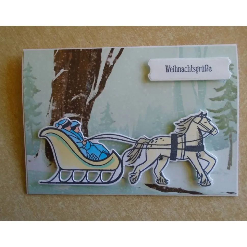 Hier seht ihr eine schöne Weihnachtskarte mit schöner Winterlandschaft zur Schlittenfahrt…