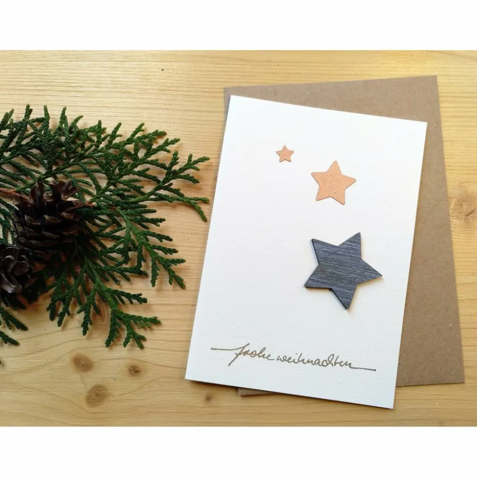 Diese cremefarbene Klappkarte ist mit dem Schriftzug „Frohe Weihnachten“ gold-glitzernder Farbe bestempelt und mit einem grau-gemusterten Holzstern sowie mehreren Sternen aus glitzerndem Tonpapier verziert. Die wunderschöne Karte wird durch einen Umschlag aus braunem Kraftpapier ergänzt.