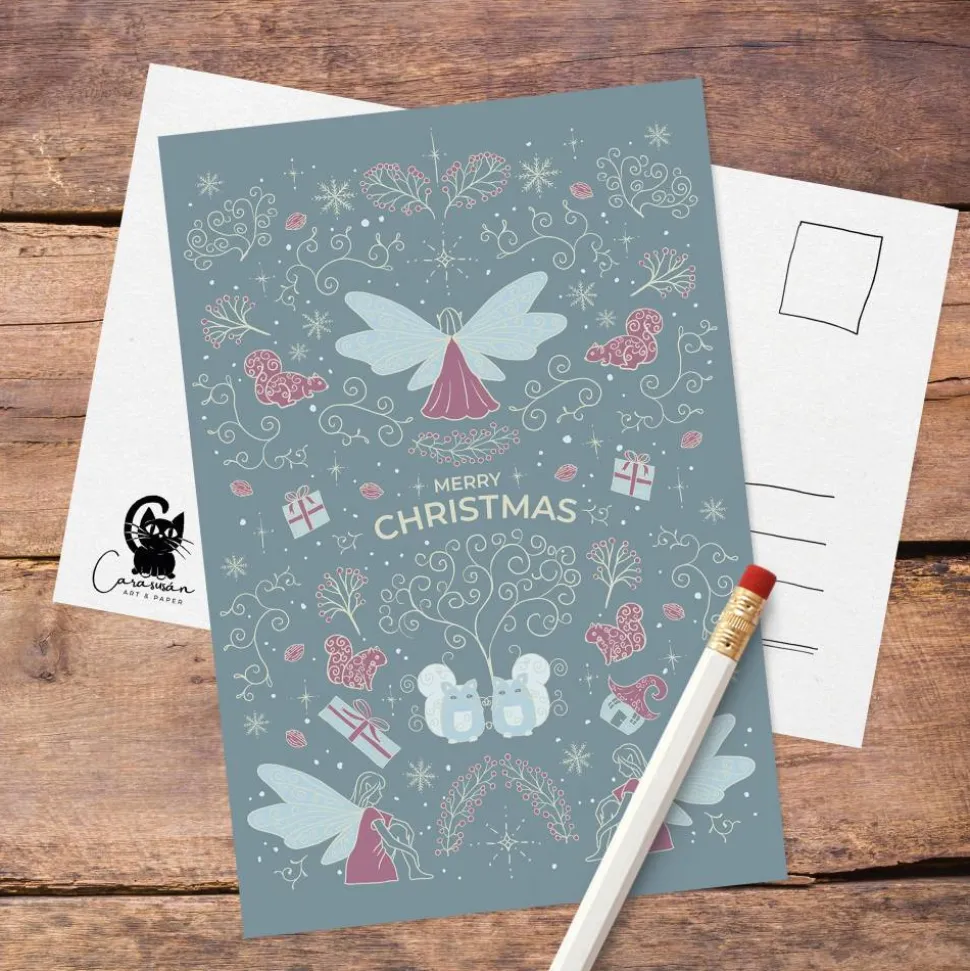 Diese Weihnachtspostkarte habe ich in zarten Eisblau- und Cremetönen gestaltet – ein kleiner winterlicher Gruß, der bewusst aus dem klassischen Farbschema tanzt. Auf der Vorderseite findest Du ein feines, ornamental gezeichnetes Muster aus Winterelfen, tanzenden Schneeflocken, einem verspielten Katzenpaar und einem leuchtenden Weihnachtsstern. All das in einem nostalgischen, leicht viktorianischen Stil, der eine besondere, märchenhafte Stimmung transportiert.