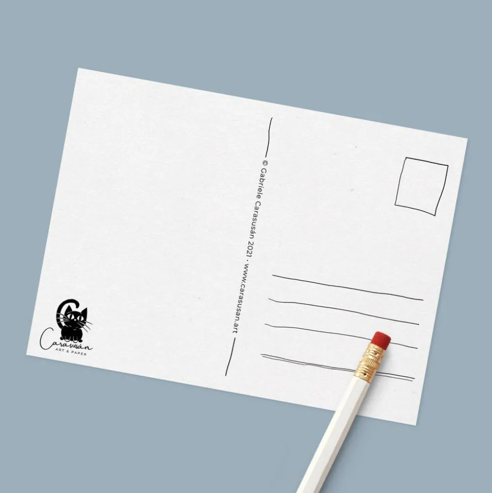 Rückseite mit klassischem Adressfeld, Briefmarkenfeld und meinem kleinen Katzenlogo