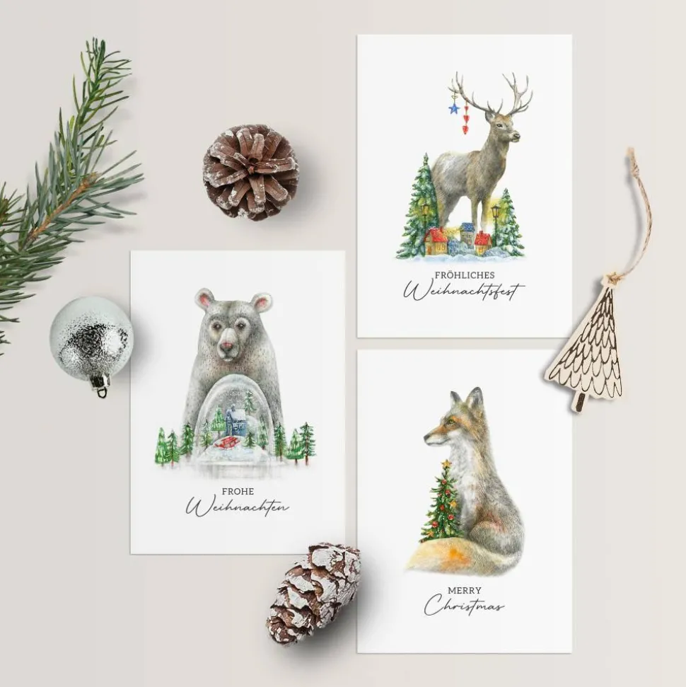 Dieses liebevoll illustrierte Karten-Set mit weihnachtlichen Tiermotiven im Aquarell-Stil eignet sich perfekt als Geschenkkarten zu Weihnachten. Die Rückseiten der Karten sind unbedruckt, sowie beschreibbar und können somit mit einer persönlichen Botschaft versehen werden.