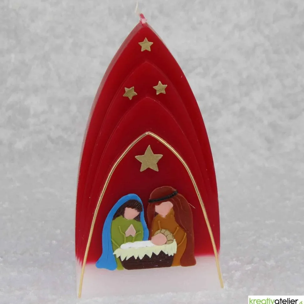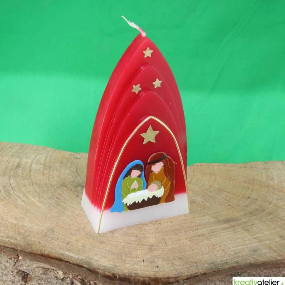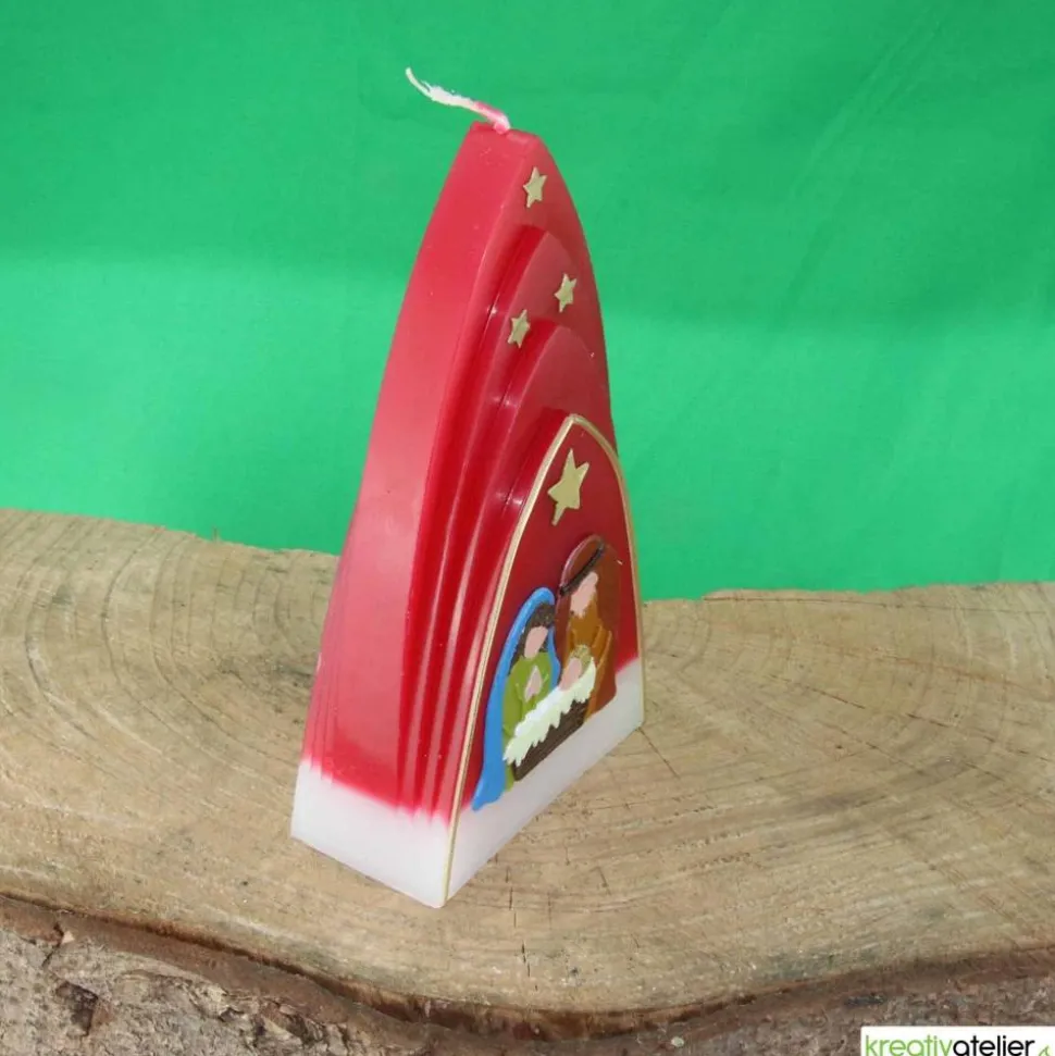 Diese besondere Formkerze zeigt das weihnachtliche Kuppelmotiv in Rot mit einem weißen Boden. Im Zentrum der Kerze steht die Darstellung der heiligen Familie – Maria, Josef und das Christkind – eingerahmt von schimmernden goldenen Sternen. Jede Verzierung wurde mit viel Liebe zum Detail von Hand gefertigt. Die Kuppelkerze wird in meiner Manufaktur in Lüdinghausen gegossen und ist nicht nur ein dekoratives Element, sondern ein echtes Kunstwerk.