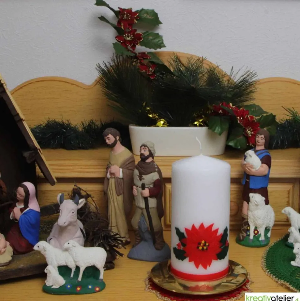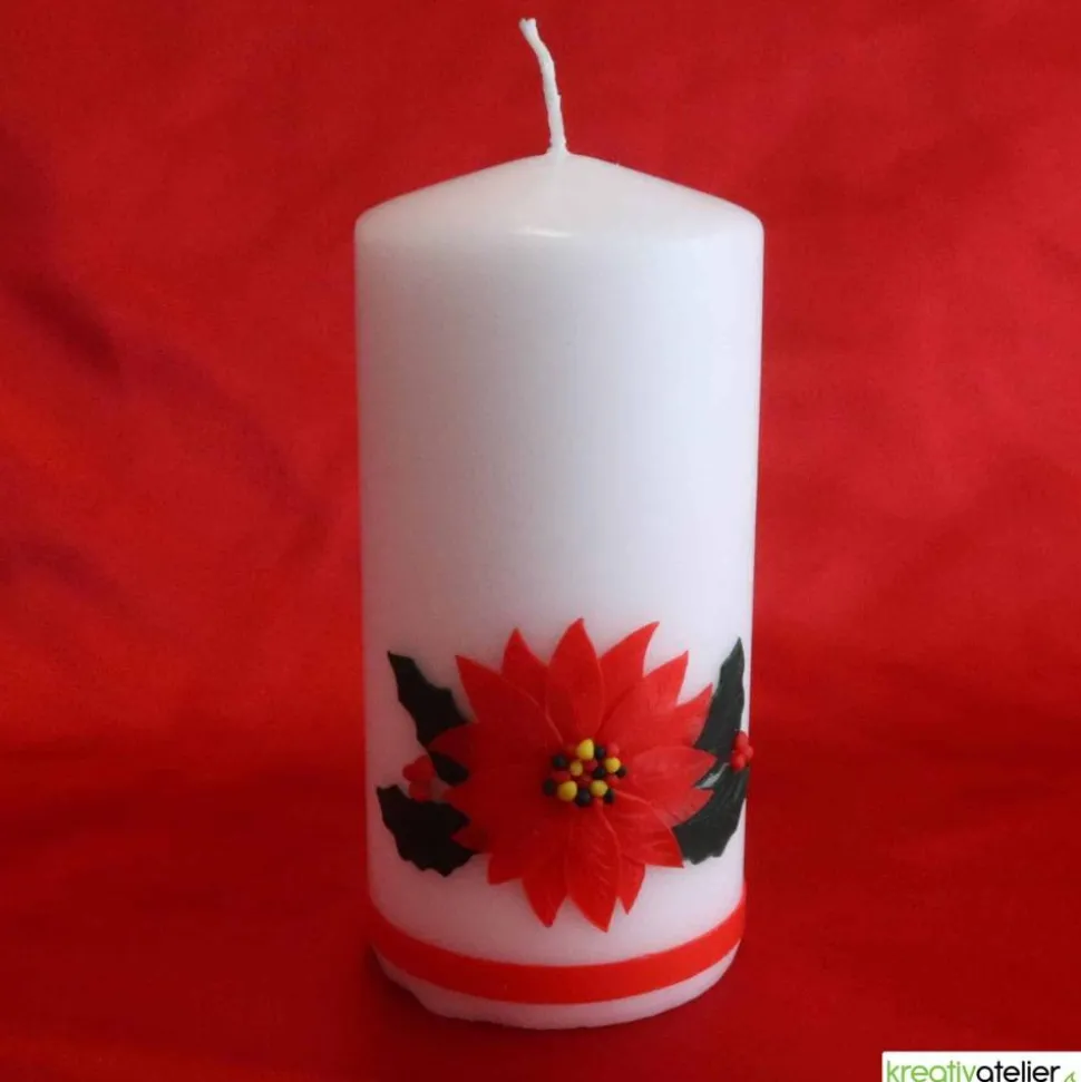 Diese weiße Weihnachtskerze ist mit einem strahlend roten Weihnachtsstern und dunkelgrünen Ilexblättern verziert. Die detailreichen Motive aus Wachs wurden sorgfältig von Hand gefertigt und sorgen für ein harmonisches, festliches Gesamtbild. Diese Kerze bringt die Weihnachtsstimmung auf stimmungsvolle Weise in Ihr Zuhause.