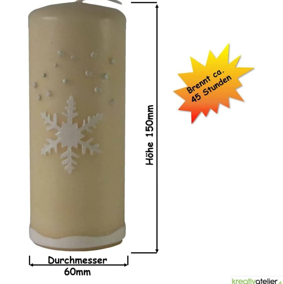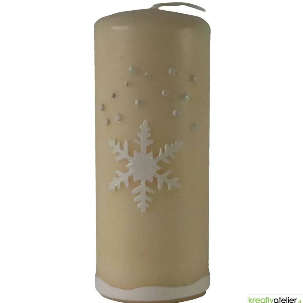 Diese edle cremefarbene Winterkerze mit einer filigran gestalteten Schneeflocke bringt winterliche Eleganz in Ihr Zuhause. Die handverzierte Schneeflocke funkelt zart im Licht und schafft eine festliche Atmosphäre, die perfekt in die kalte Jahreszeit passt. Die Cremefarbe verleiht der Kerze eine sanfte, edle Ausstrahlung, die sich harmonisch in jede Weihnachtsdekoration einfügt.