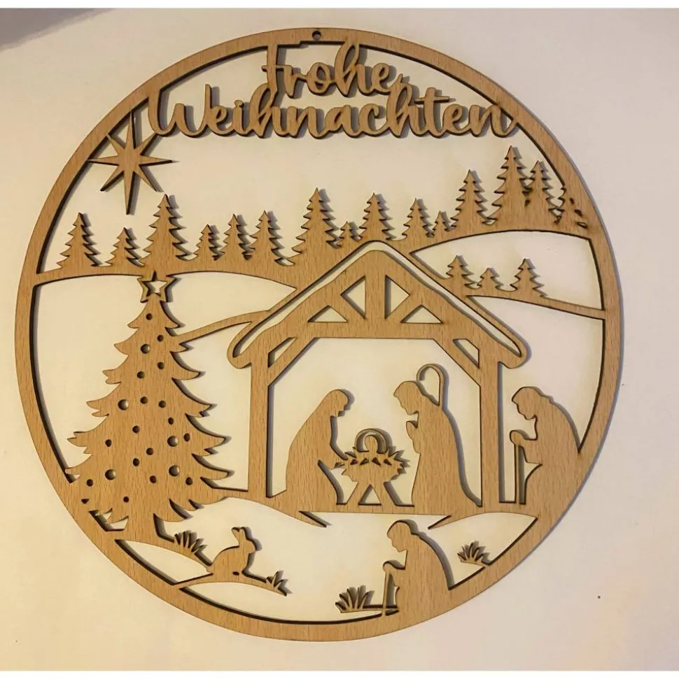 Bringe die festliche Stimmung in dein Zuhause mit diesem liebevoll gestalteten Weihnachtskranz aus Buchen-Sperrholz, der das Krippenspiel zeigt. Mit den Maßen 25×25 cm ist er die perfekte Dekoration für Fenster, Wand oder Türen und lässt sich wunderbar in deine Weihnachtsdeko integrieren.