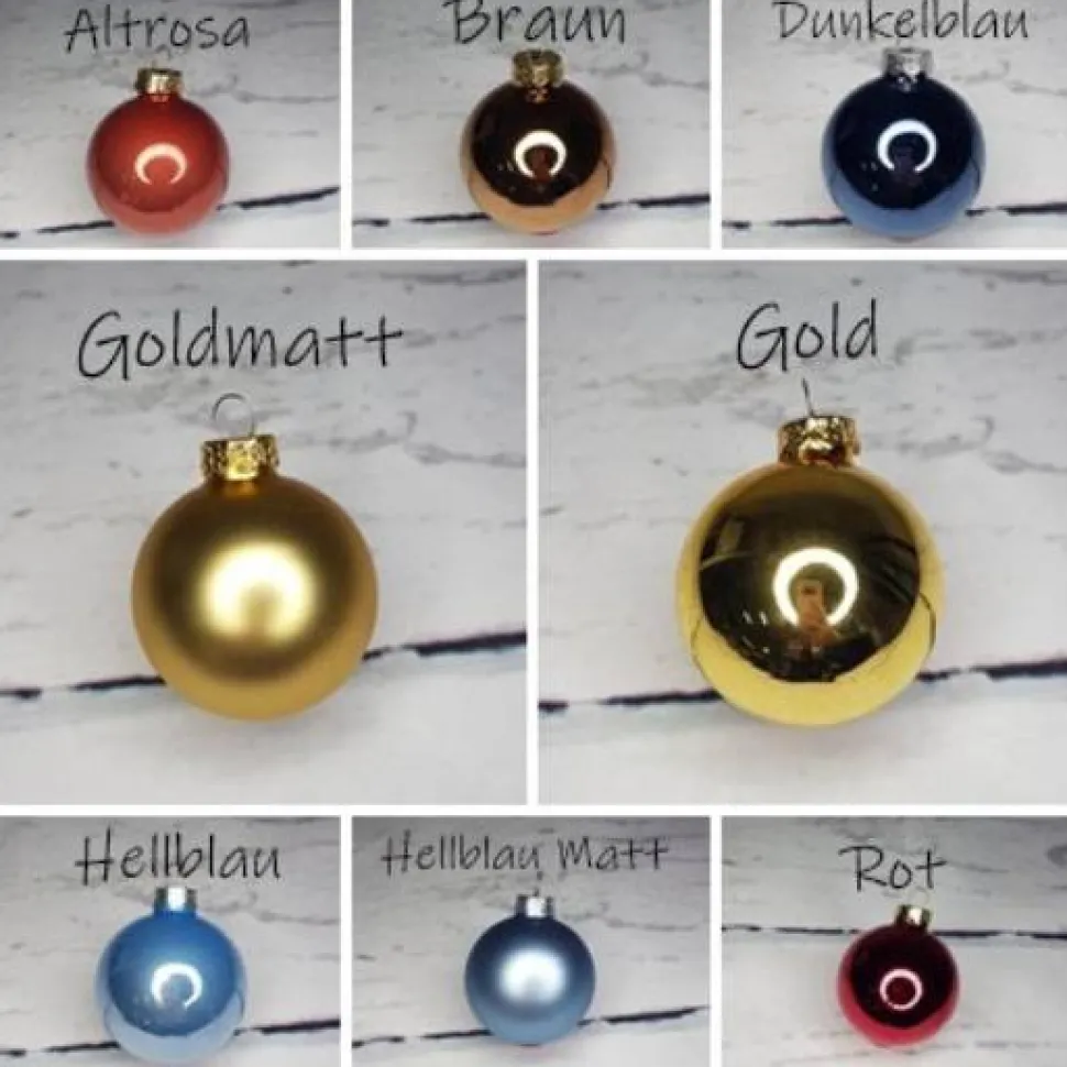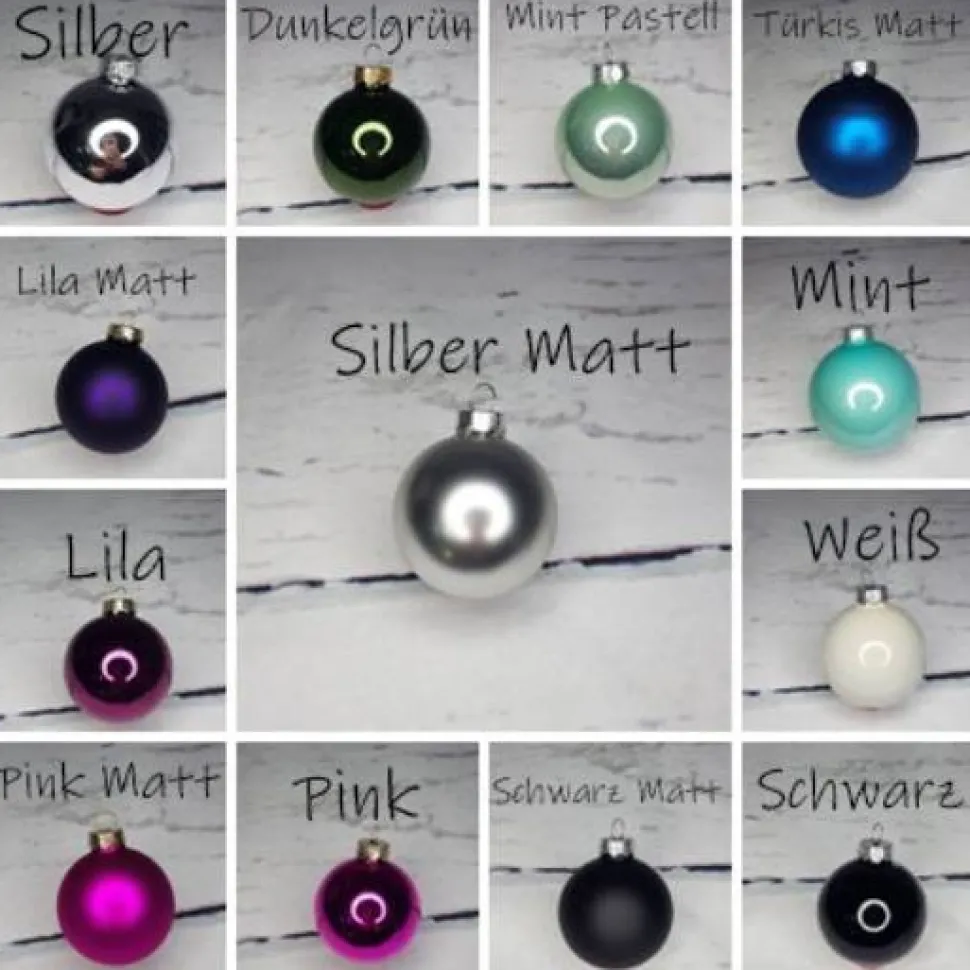 Es sind viele verschiedene Farben vorrätig, sowohl an Kugeln als auch für die Schrift.