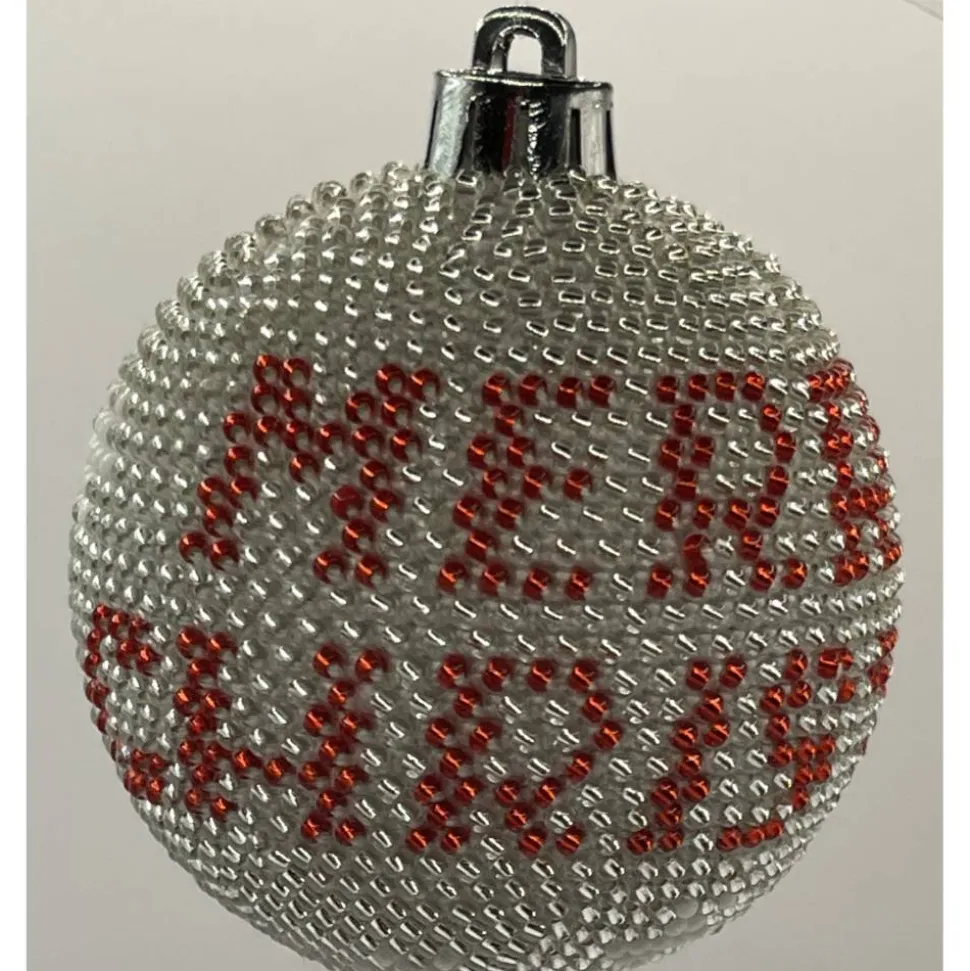 Es werden Kunststoff Weihnachtskugeln mit aufgefädelten Glasperlen umhäkelt.