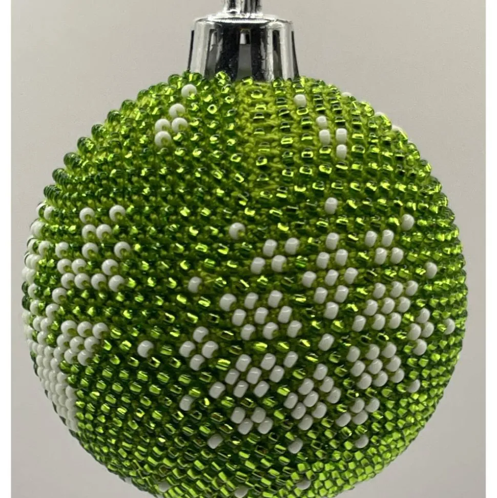 Es werden Kunststoff Weihnachtskugeln mit aufgefädelten Glasperlen umhäkelt.