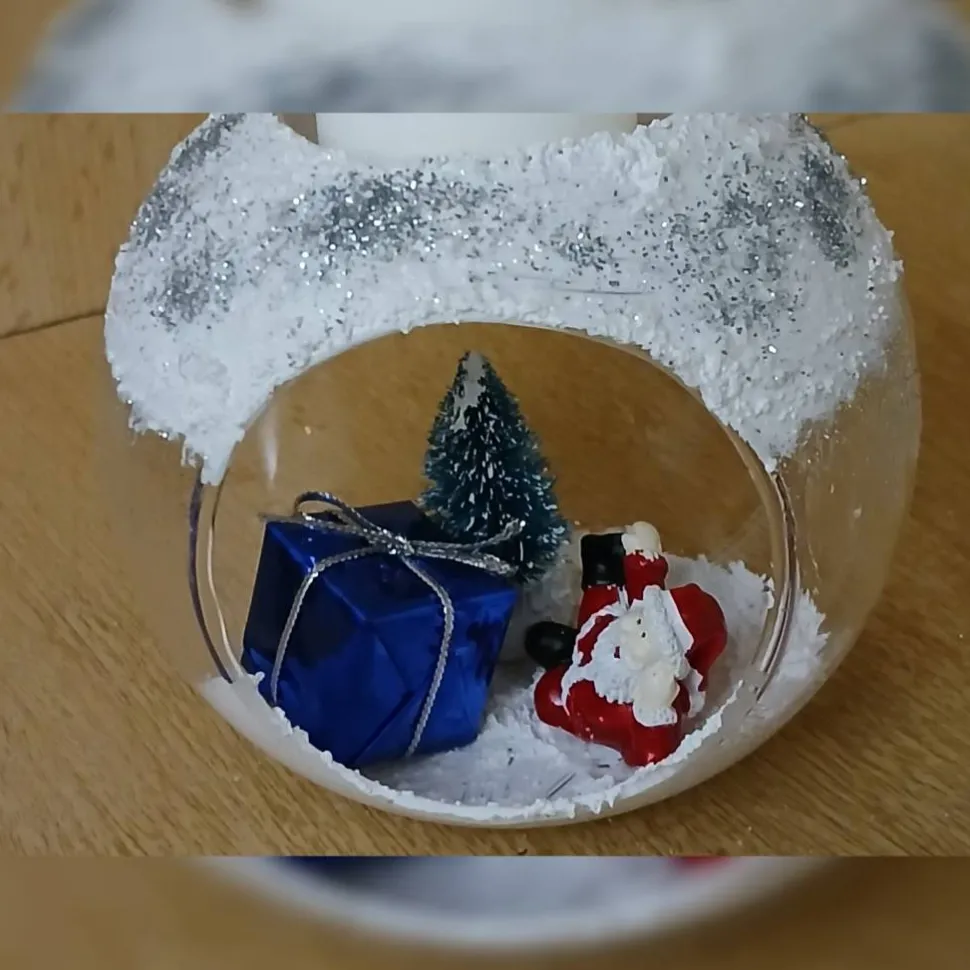 Im Inneren des Winterdeko Windlichts verbirgt sich eine kleine, detailreiche Weihnachtslandschaft. Ein fröhlicher Weihnachtsmann steht neben einem verschneiten Tannenbaum und verbreitet sofort gute Laune. Direkt neben ihm befindet sich ein kleines Mini-Geschenk, das an die Freude des Schenkens und die Magie der Weihnachtstage erinnert. Dekoschnee rundet die Szene harmonisch ab und lässt die Szenerie wie eine Miniatur-Winterwelt erscheinen. Diese liebevolle Gestaltung macht den Winter Kerzenhalter zu einem dekorativen Highlight mit nostalgischem Charme.