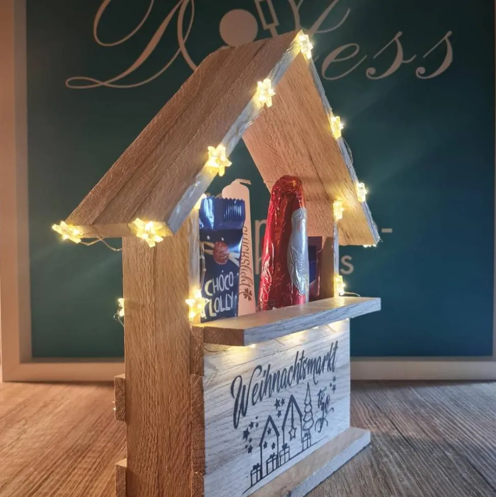 Ein Weihnachtsmarkt „to go“ – für alle, die Glühwein, Lichterglanz und Budenzauber lieben, aber nicht unbedingt durch die Kälte stapfen wollen. Dieser kleine Marktstand aus Eiche-Holzklötzchen bringt dir das Weihnachtsmarktgefühl direkt nach Hause – als liebevolle Dekoidee oder als originelles Geschenk in der Adventszeit.