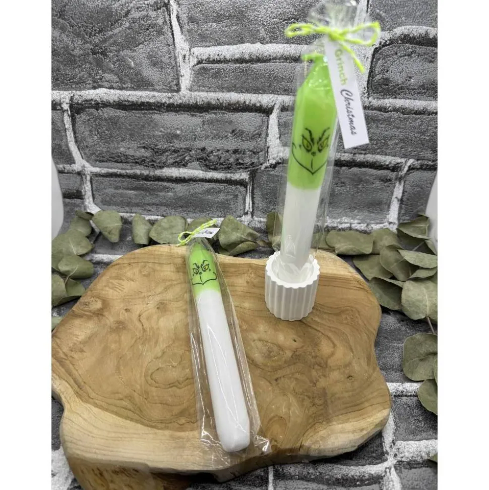 Die Kerze wurde getaucht in Grünem Wachs, die Wasserschiebefolie ist mit einem Gesicht auf der Kerze aufgebracht, diese brennt rauchfrei mit ab.