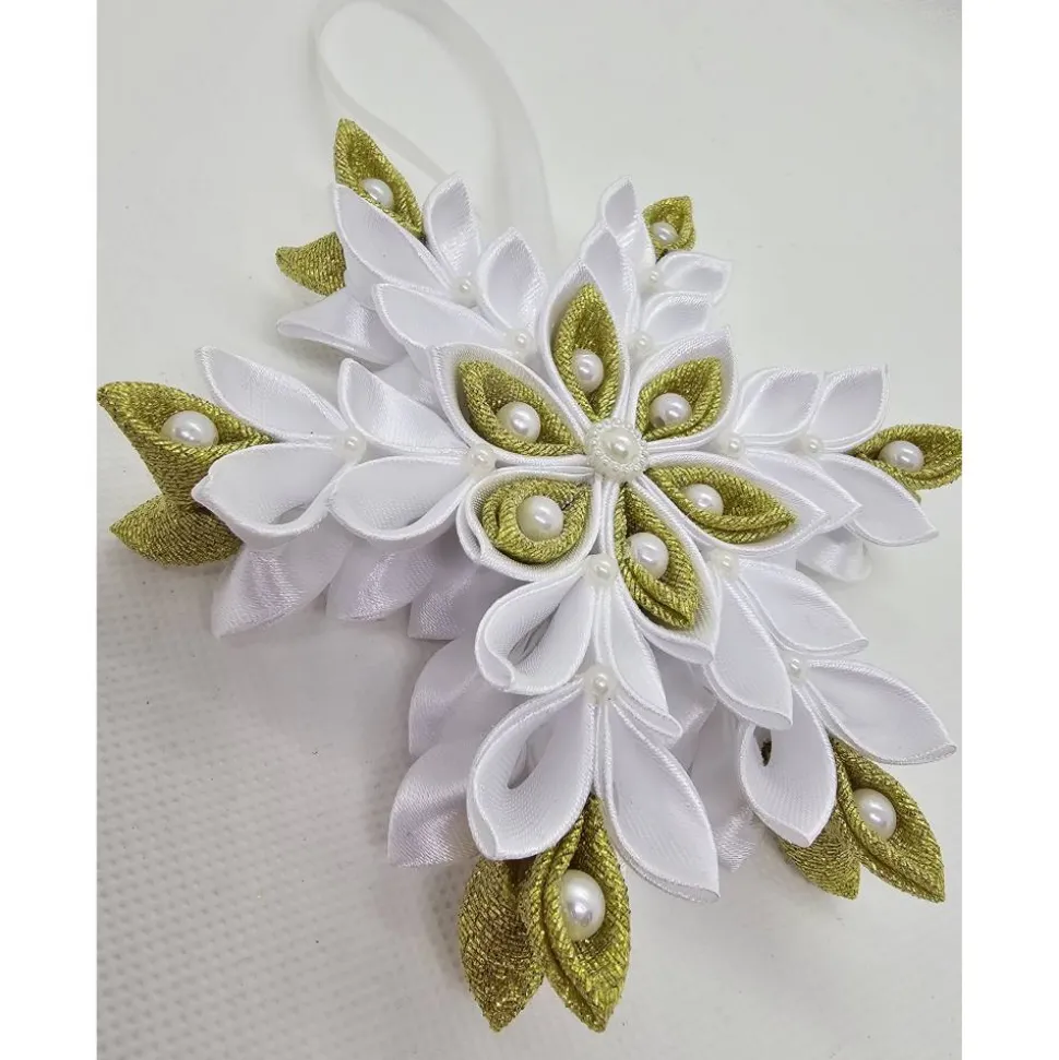 – Materialien: Satinband, Brokatband, Schmucksteine und weiße Perlen