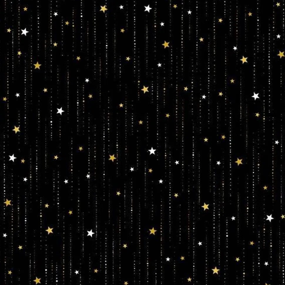 Entdecke den festlichen Weihnachtsstoff Baumwolle mit Xmas-Stars! Dieser hochwertige Baumwolldruck präsentiert die beliebtesten Weihnachtsmotive: goldene und weiße Sterne auf edlem schwarzen Hintergrund.