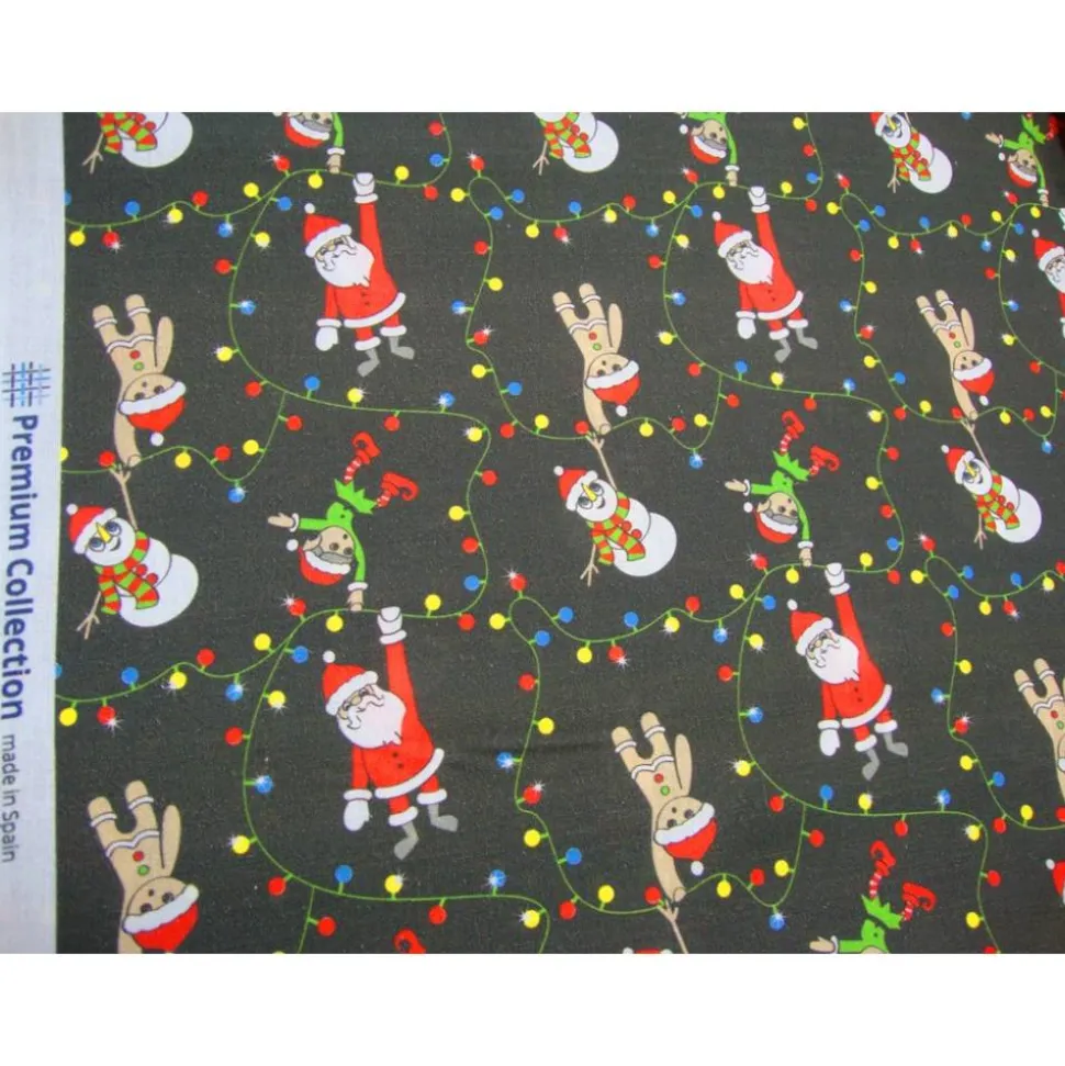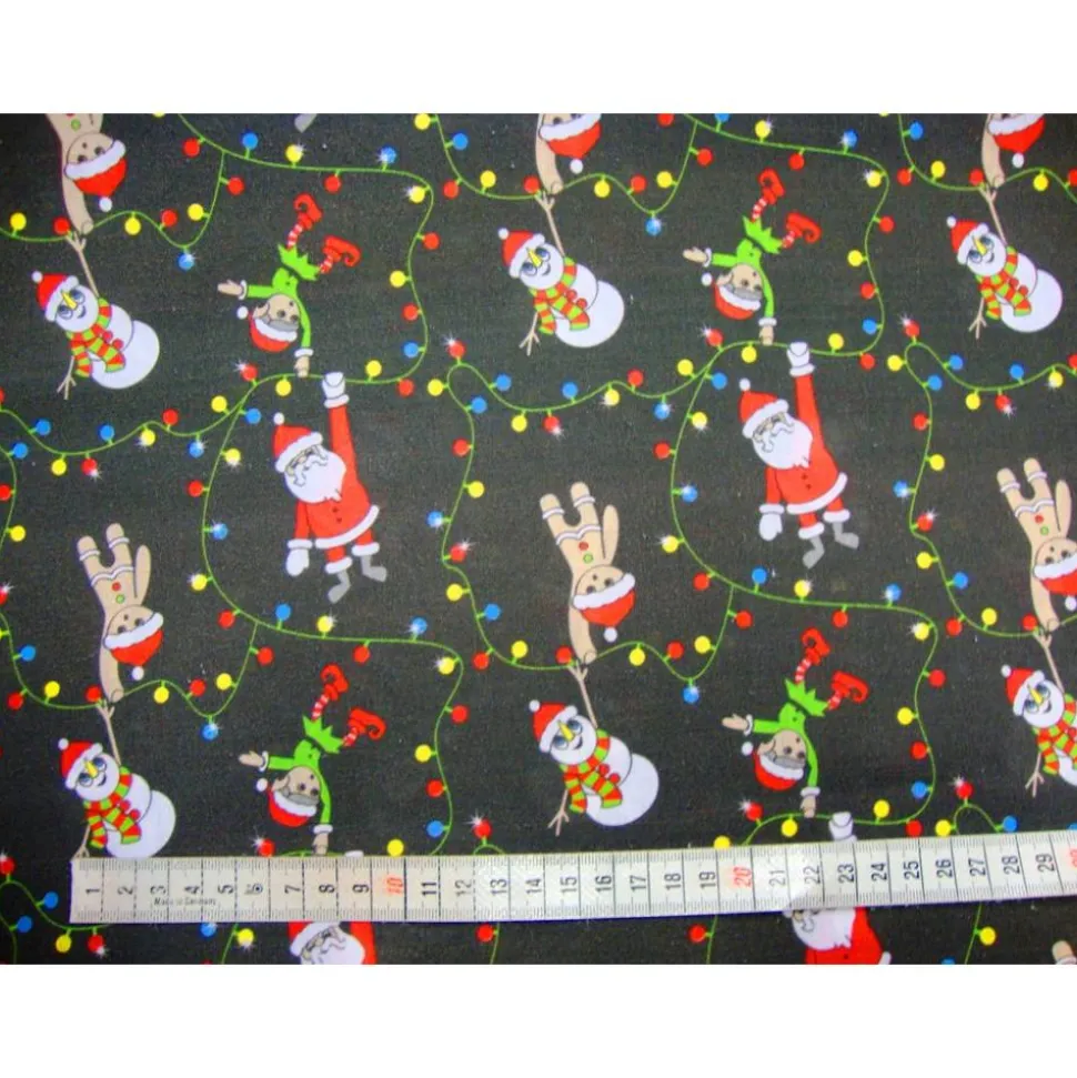 Entdecke festliche Weihnachtsstoffe aus 100% Baumwolle! Dieser hochwertige Webstoff begeistert mit einzigartigen Motiven: Lichterkette, Nikolaus, Schneemann, Weihnachtsmann, Lebkuchenmann und Elfen auf schwarzem Hintergrund mit bunten und roten Akzenten.