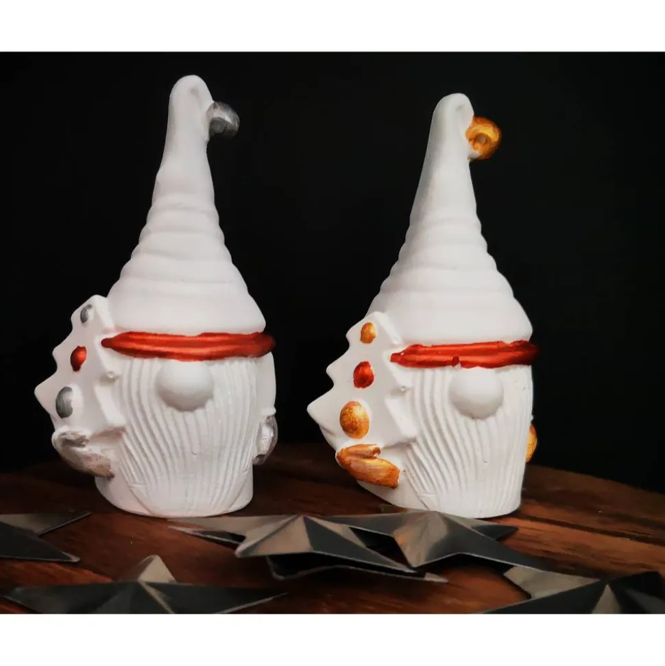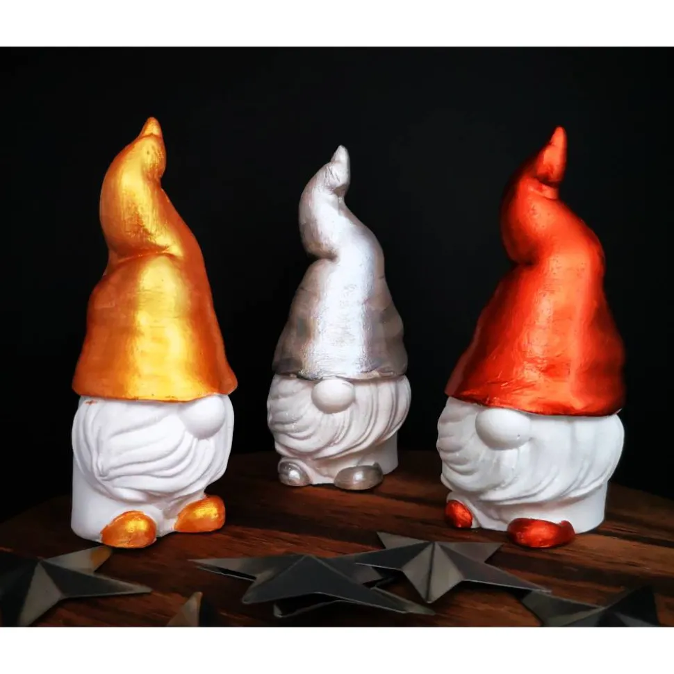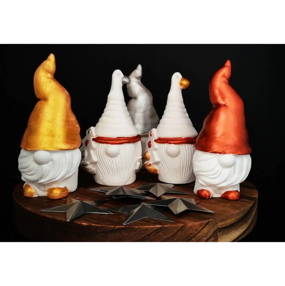 Ein Wichtel ist ca. 10 cm groß und kann in puristischem Weiß oder verziert in Gold, Silber und Kupfer erworben werden.