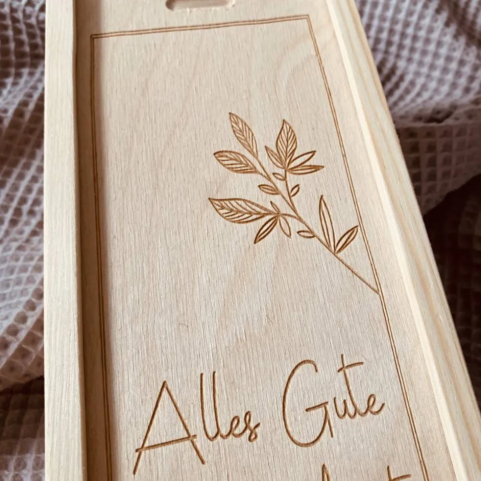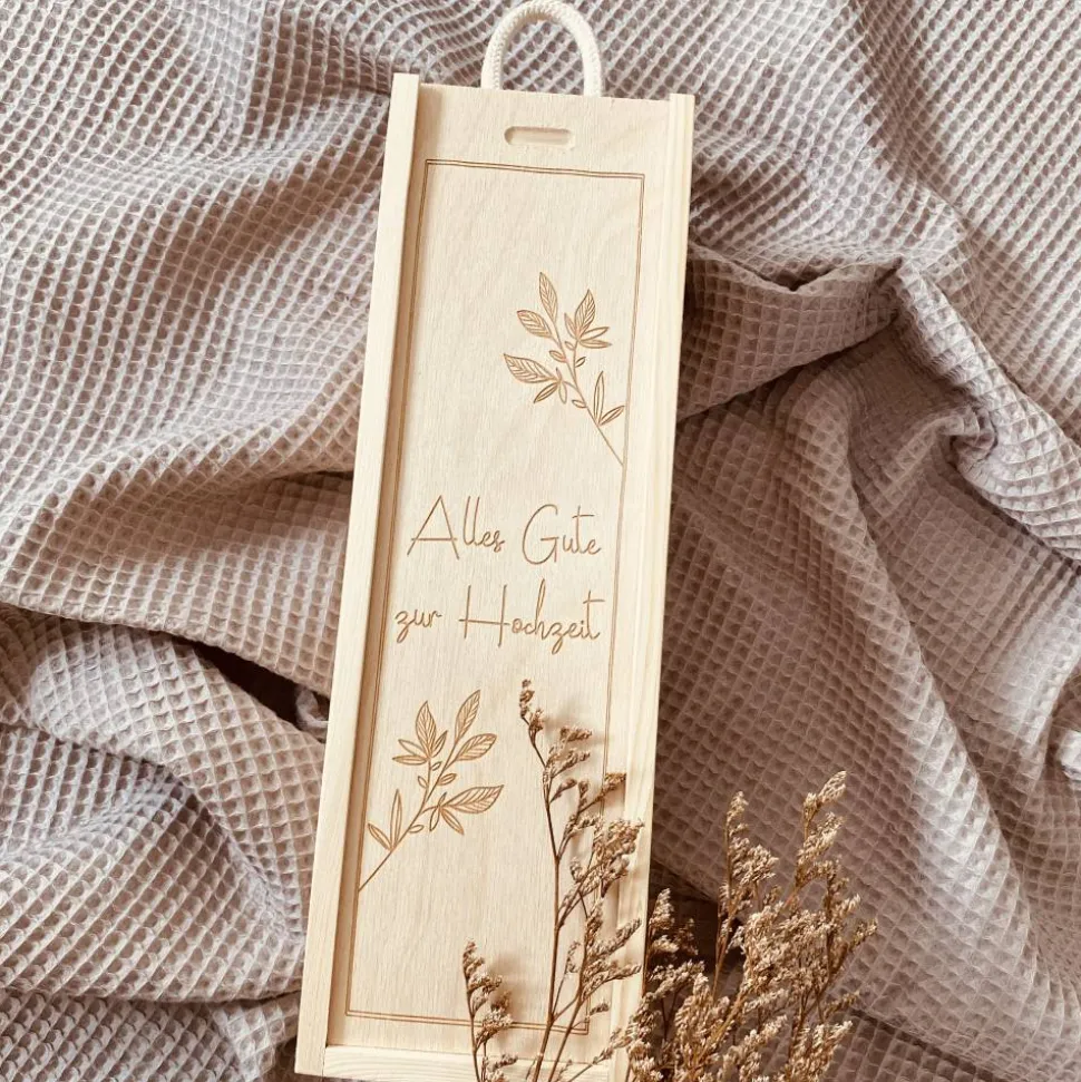 *Die Weinflasche und Dekoration sind nicht mit in der Lieferung enthalten. Es wird nur die gravierte Weinkiste geliefert.*