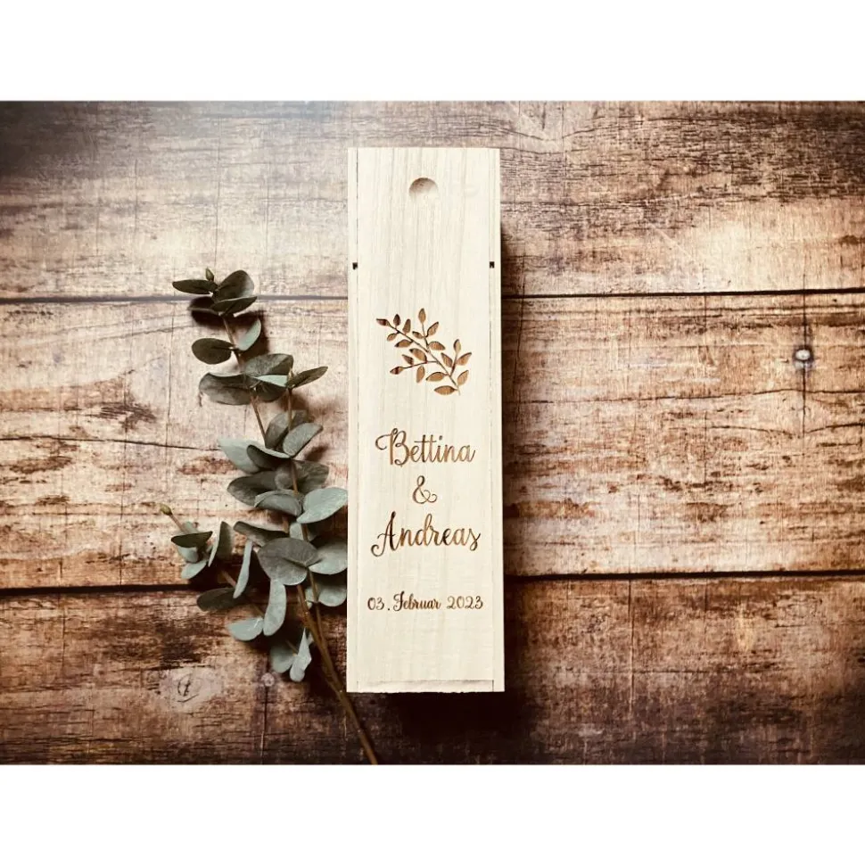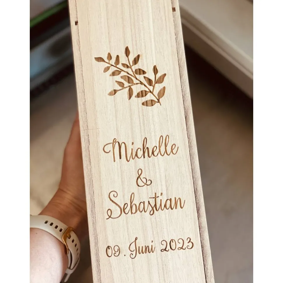 *Die Weinflasche und Dekoration sind nicht mit in der Lieferung enthalten. Es wird nur die gravierte Weinkiste geliefert.*