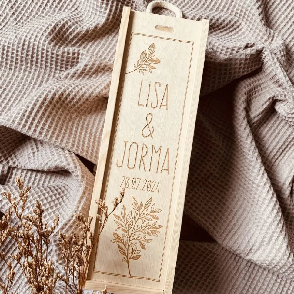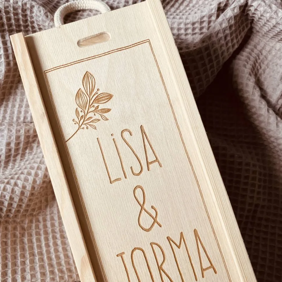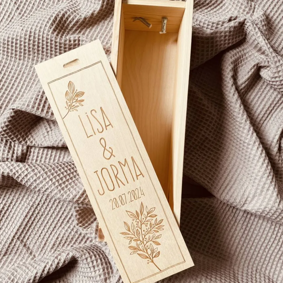 *Die Weinflasche und Dekoration sind nicht mit in der Lieferung enthalten. Es wird nur die gravierte Weinkiste geliefert.*
