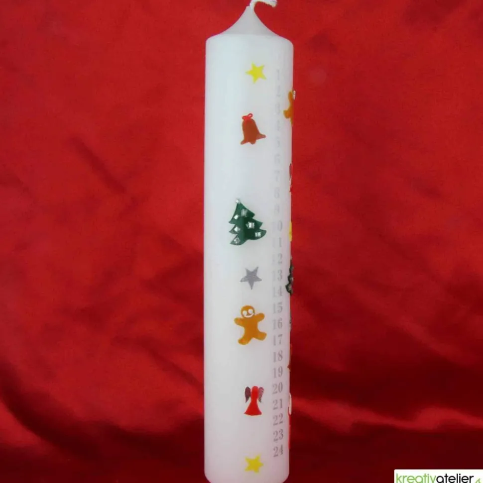 … und das jeden Tag! Meine Adventkalenderkerze ist aufwändig von Hand mit Wachs verziert. Die Skala von 1 bis 24 schenkt Ihnen jeden Tag wärmendes Kerzenlicht und begleitet Sie durch die gesamte Adventzeit. Weihnachtliche Sinnbilder wie Engel und Tannenbäumchen befinden sich links und rechts der Scala und wechseln sich mit alltäglichen Symbolen wie Glocken und Sternen ab. Alle Ornamente werden einzeln von Hand aus verschiedenen Wachsplatten ausgeschnitten und kunstvoll auf der Kerze arrangiert. Auf Wunsch kann die Kerze unterhalb der Scala mit einem Namen personalisiert werden. Die Beschriftung erfolgt mit Wachsbuchstaben in silber.