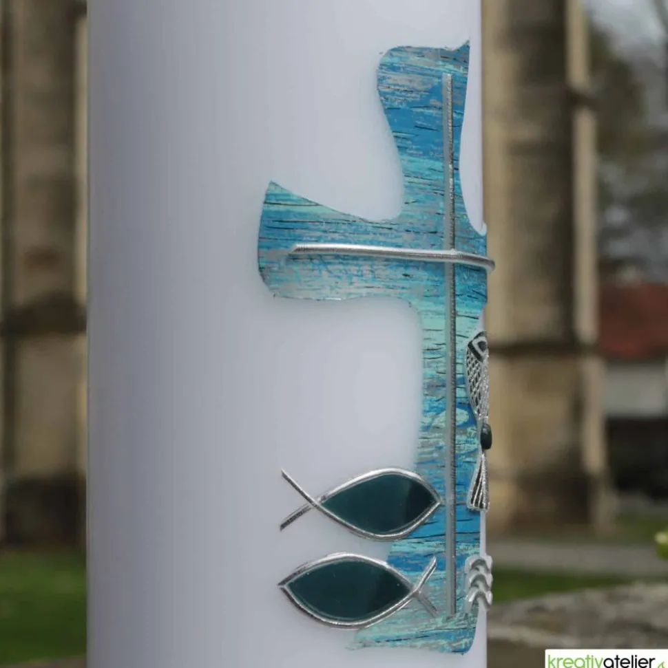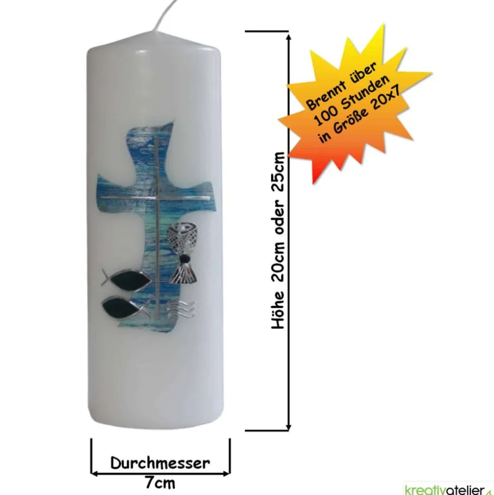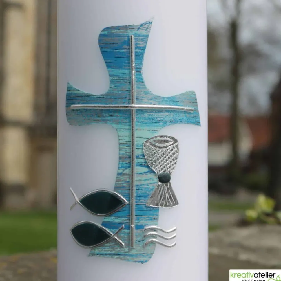 Diese wunderschöne weiße Konfirmationskerze mit blau silbernem Kreuz in Wellenform, Fischen, Wellen und Kelch ist mehr als nur eine Kerze – sie ist ein Symbol für die bedeutsamen Ereignisse im Leben eines jeden Konfirmanden. Die Wellen, die Fische und der Kelch stehen für die Reinigung, das Leben und die spirituelle Bedeutung der Konfirmation, während das Kreuz in Wellenform den Weg des Glaubens darstellt, der sich wie das tiefblaue Meer ausdehnt und bewegt.