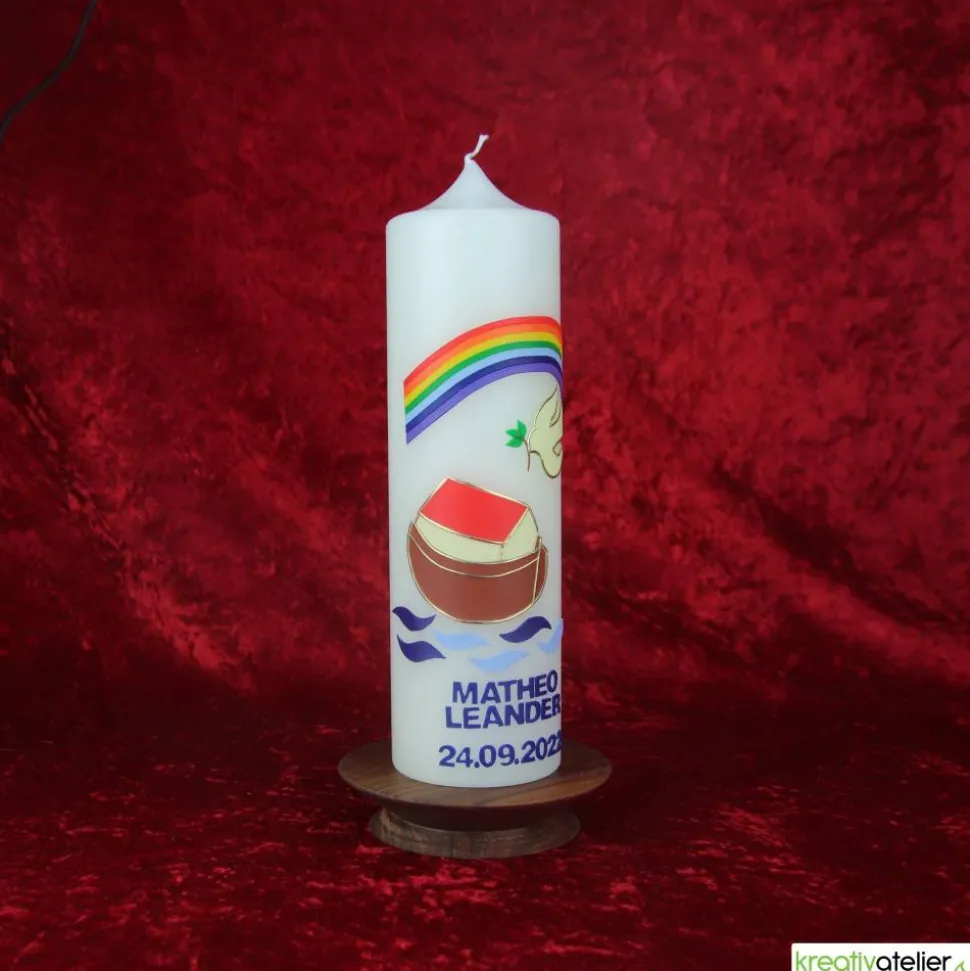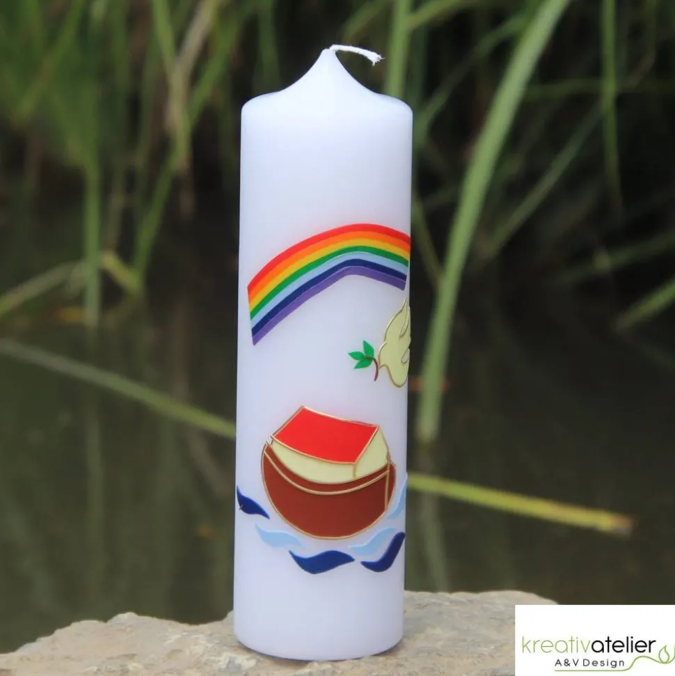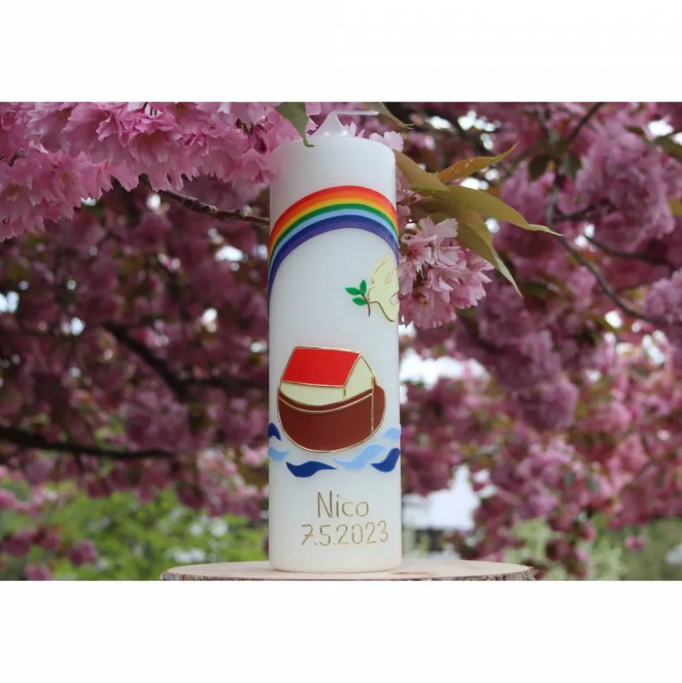 Die Arche Noah auf der Kerze steht für Rettung und Schutz und verleiht ihr eine hoffnungsvolle Ausstrahlung. Das Wasser mit dem Regenbogen, das die Arche umgibt, symbolisiert das heilige Ritual der Taufe und die Reinigung des Geistes und der Seele. Die Taube mit dem Zweig neben der Arche betont die Bedeutung von Frieden und Hoffnung und verleiht der Kerze eine spirituelle Bedeutung.
