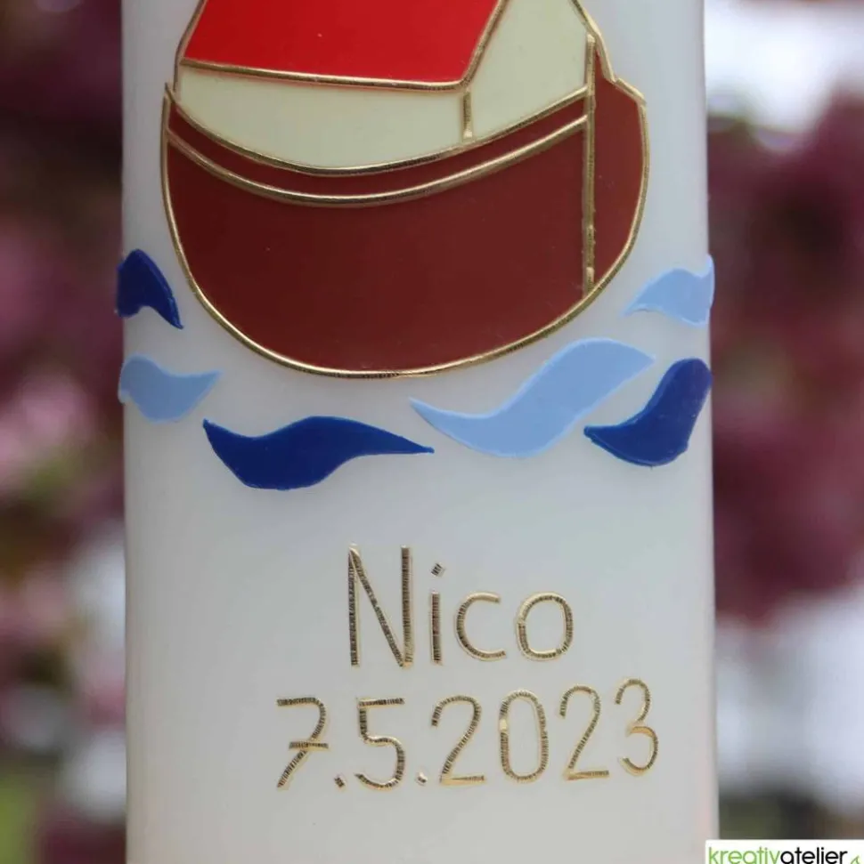 Auch die Beschriftung erfolgt mit echten Wachsbuchstaben. Im Preis enthalten sind maximal 2 Vornamen und ein Datum bestehend 6 Ziffern (z.B. 22.10.23).