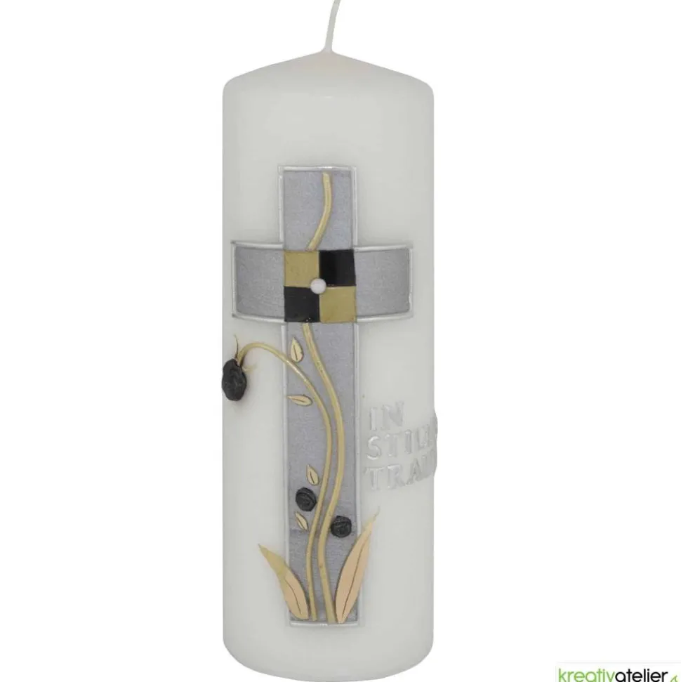 Eine Trauerkerze ist ein würdevolles und edles Andenken an einen verstorbenen Menschen. Die Trauerkerze „In stiller Trauer“ mit Kreuz, silber-gold verziert, ist eine besonders stilvolle Variante.