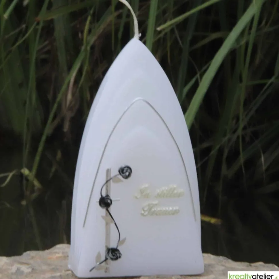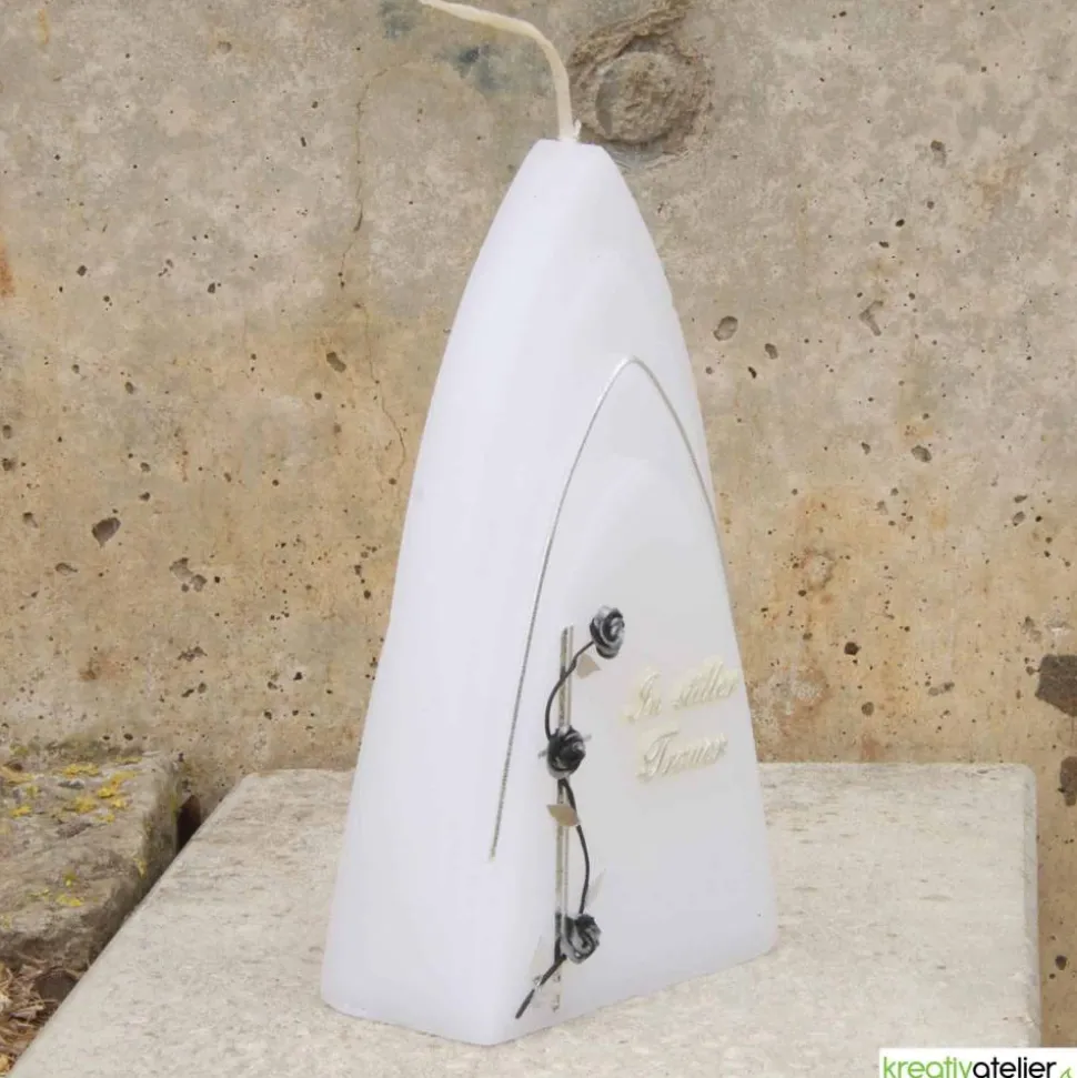 Diese moderne Trauerkerze ist ein stilvolles und edles Accessoire, um in stiller Trauer Abschied von einem geliebten Menschen zu nehmen. Die Gedenkkerze ist von Hand mit echtem Wachs verziert und personalisierbar.