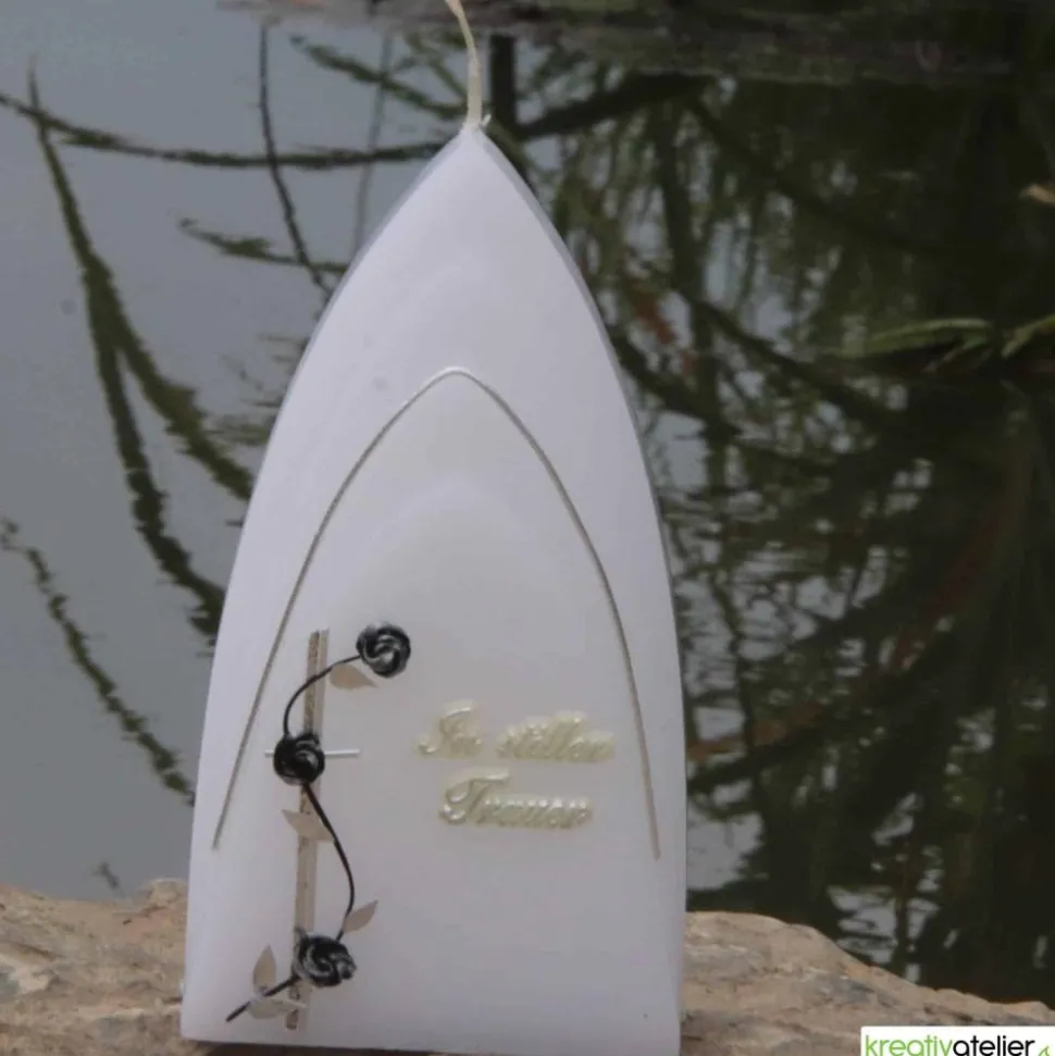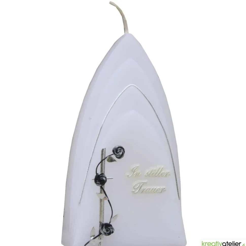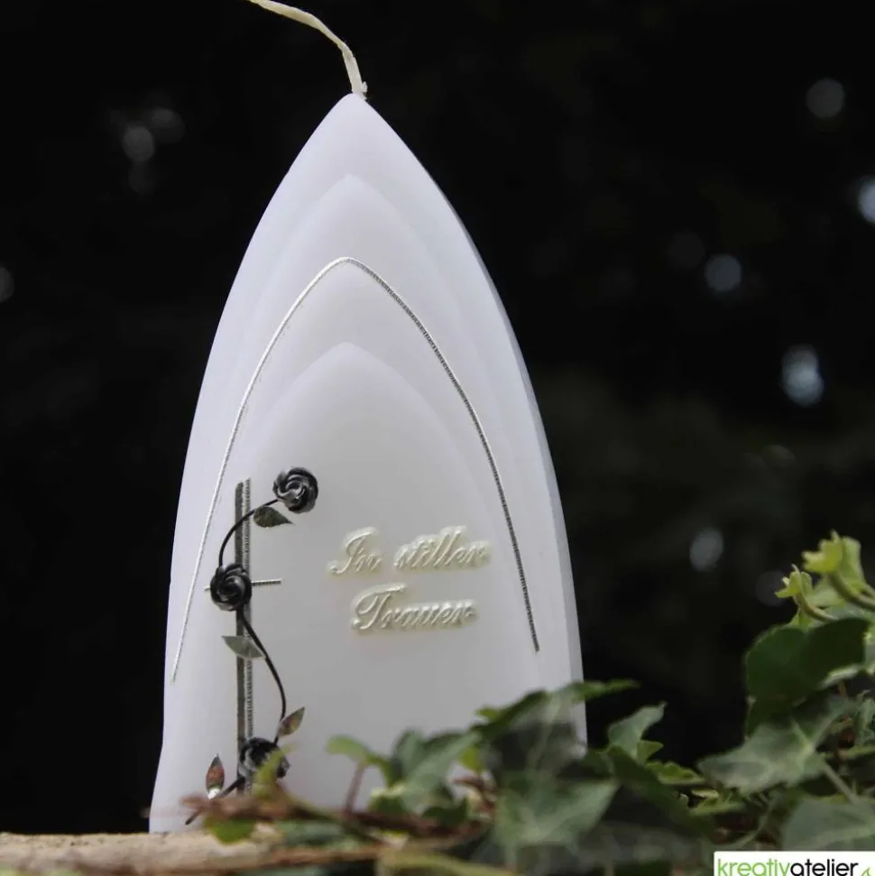 Das antiksilberne Kreuz bildet den dezenten Hintergrund für die Rosenranke aus schwarz-silbernen Rosen. Die Kombination dieser Symbole auf der Trauerkerze schafft eine ruhige und besinnliche Atmosphäre, die zum Gedenken und zur Trauerbewältigung beitragen kann. Eine stilvolle Ergänzung zum Kreuz bildet der Schriftzug „In stiller Trauer“ aus Echtwachs.