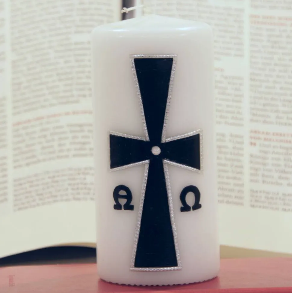 Die Trauerkerze mit Kreuz, schwarz/silber verziert, ist ein Unikat, das in Handarbeit verziert wird. Das byzantinische Kreuz in Schwarz auf der weißen Trauerkerze symbolisiert das Leben und den Tod. Das Alpha und Omega in Silber auf dem Kreuz verstärkt dieses Sinnbild noch einmal. Der silberne Rahmen am Kreuz und die kleine Perle in seiner Mitte verleihen der Trauerkerze etwas Edles und machen sie zu einem besonderen Andenken an den Verstorbenen.