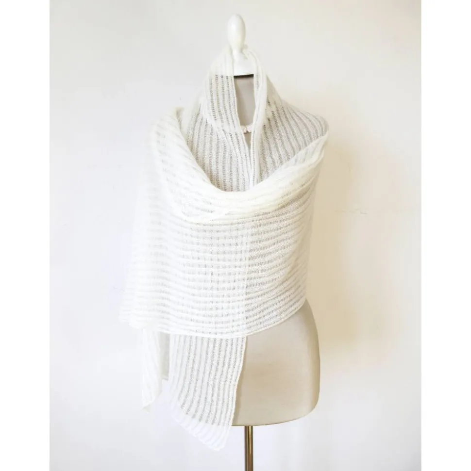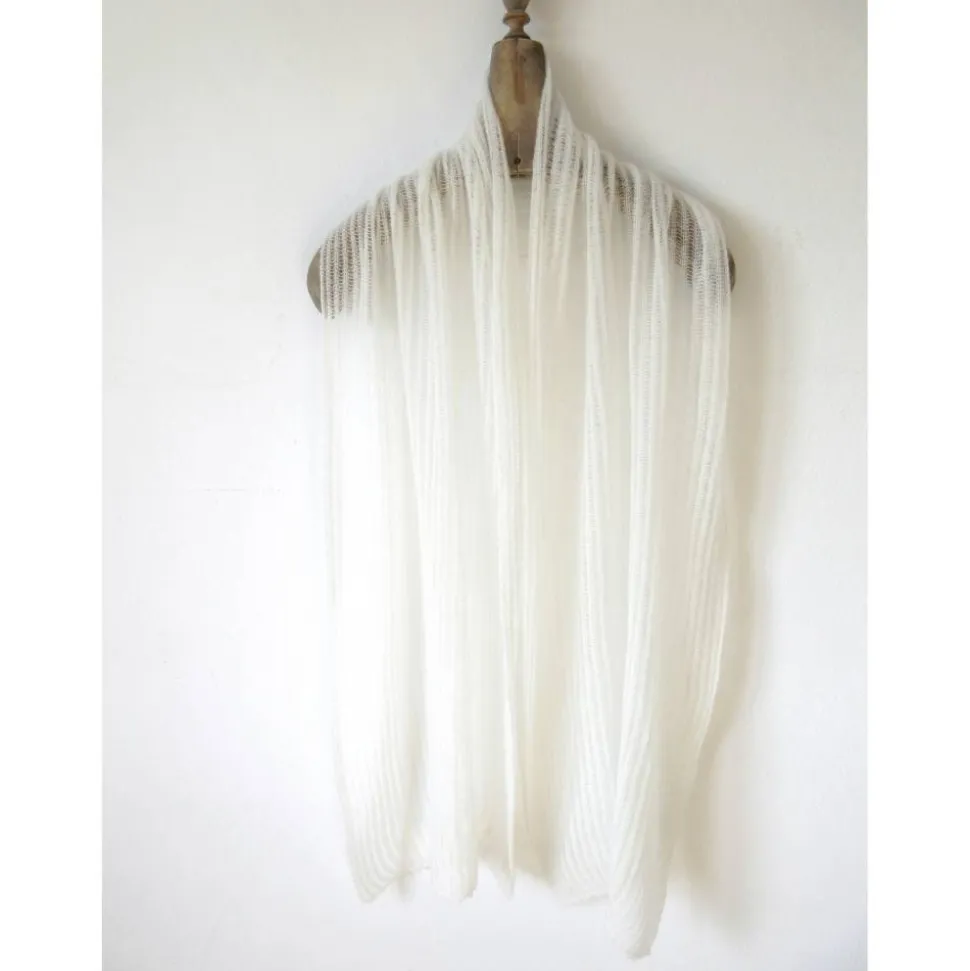 Der minimalistische Schal ist in Feinstrick gefertigt und hat an beiden Endkanten kleine Zähnchen-artige Häkelbordüren.