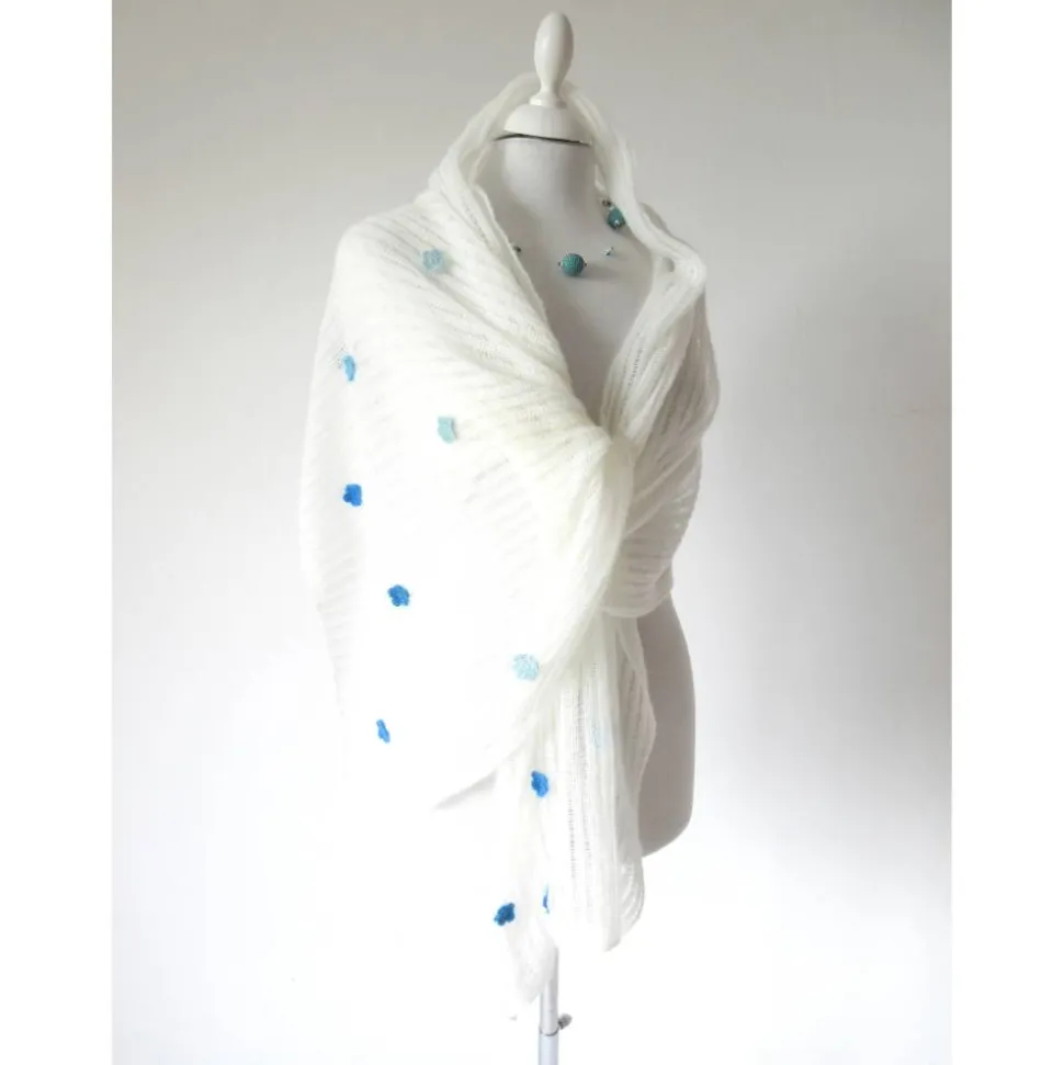 Der Strick ist schlicht und zart, doch die kleinen Blüten in verschiedenen Blau-Tönen, geben dem Schultertuch die Raffinesse.