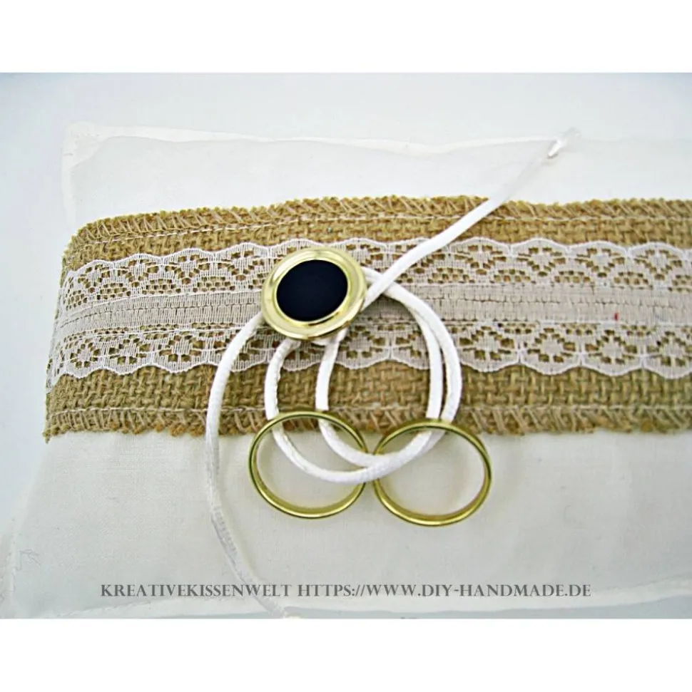 Handgemacht aus Franken und als Unikat von KreativeKissenwelt gefertigt, verbindet es rustikalen Charme mit edler Optik. Der weiße Baumwollstoff ist mit einem spitzenbesetzten Jutestreifen übernäht und folgt damit dem aktuellen Trend von Sackleinen. Eine elegante Satinkordel hält sicher deine Eheringe – befestigt an einem stilvollen Knopf.