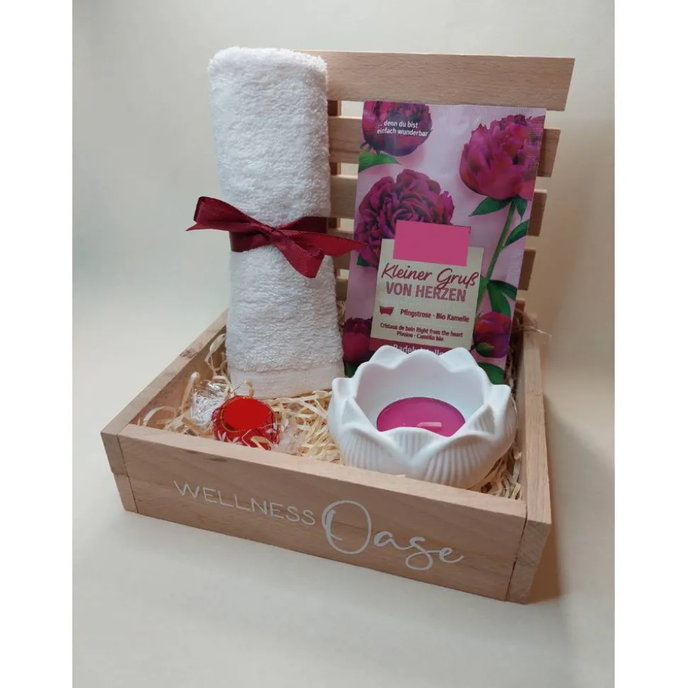 – 1 handgemachte Holzbox mit Schriftzug „Wellness Oase“