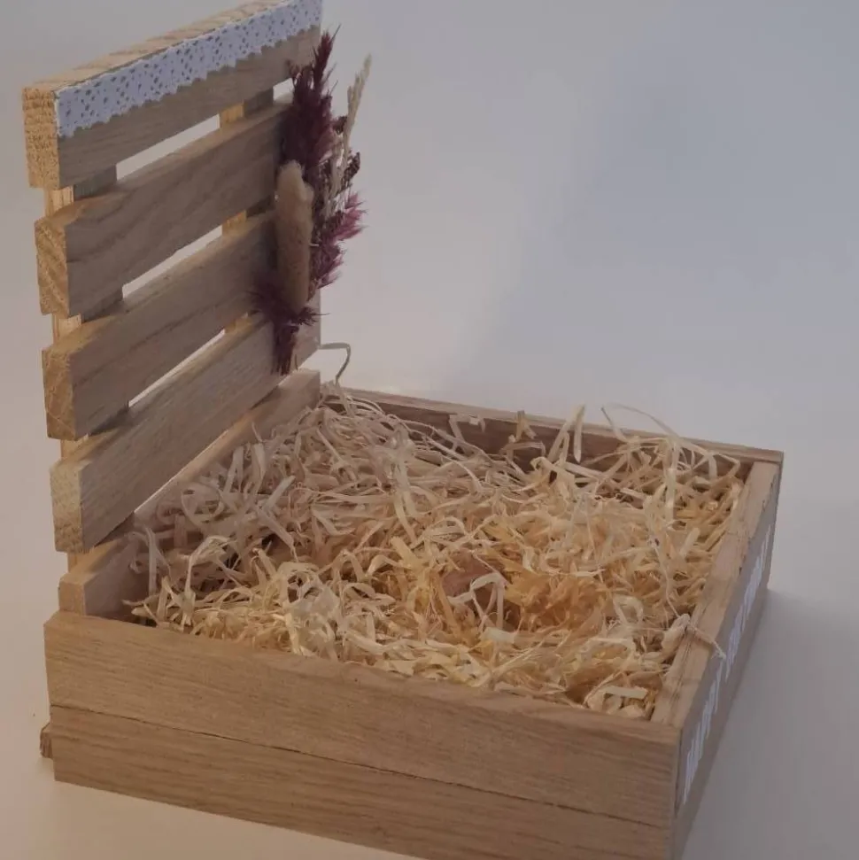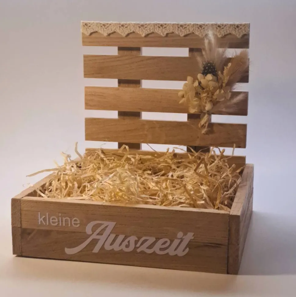 Alle Produkte sind in einer rustikalen Holzkiste arrangiert, die Du später als Aufbewahrung, Deko oder Geschenkverpackung weiterverwenden kannst.