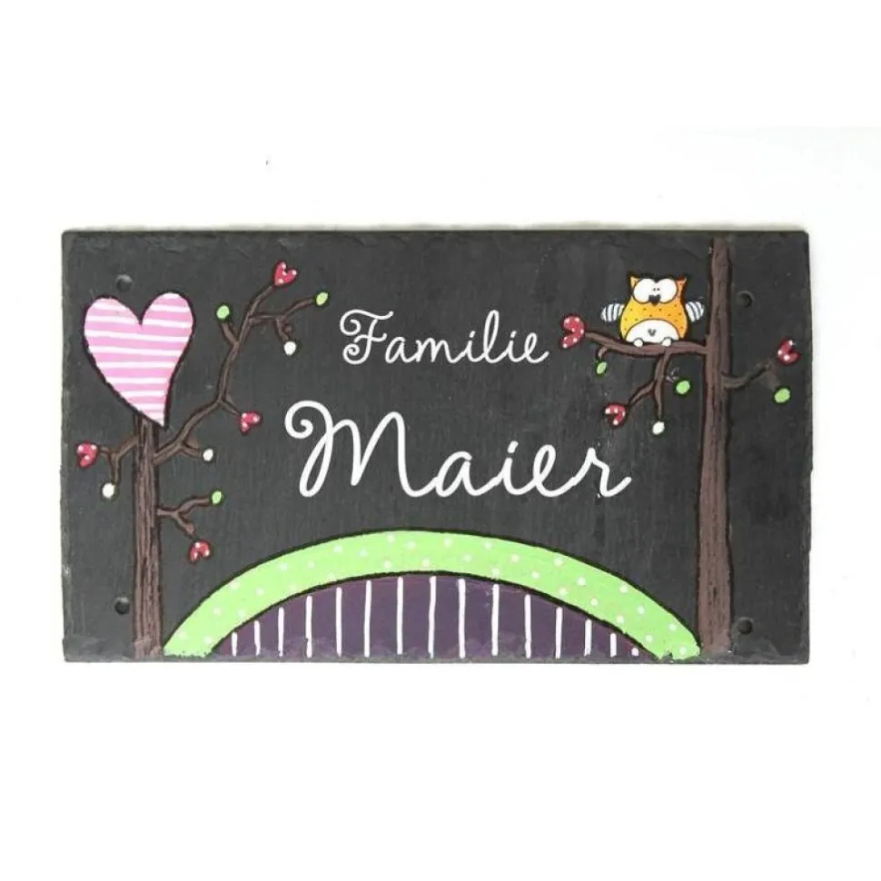 Das Haustürschild aus Naturschiefer ist mit Rondell, Herzbaum und Eule auf Ast bemalt und wird zweizeilig in deiner Wunschschriftart mit „Familie“ und Namen beschriftet. Die Maße betragen 15 x 25 – 30 cm (je nach Namenslänge). Du kannst zwischen Aufhängekordel oben oder vier Bohrungen zur Wandmontage wählen.