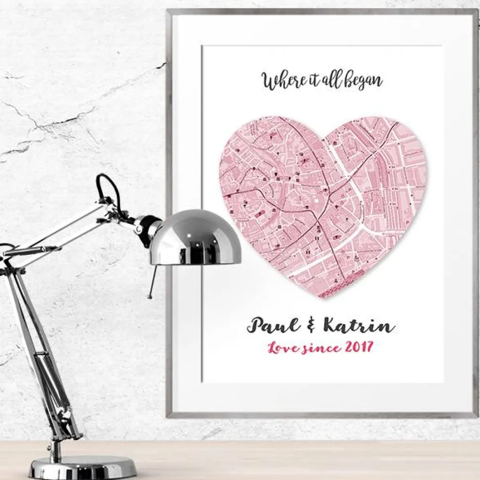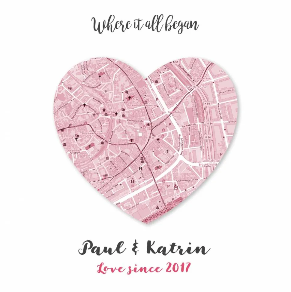 Schreibt uns einfach in das Kommentarfeld, welche Stadt, Region oder welchen Stadtteil ihr in den Druck integriert haben wollt. Der Spruch über dem Herz (where it all began) kann gegen einen Wunschspruch getauscht werden. Auch das „Love since“ kann verändert werden