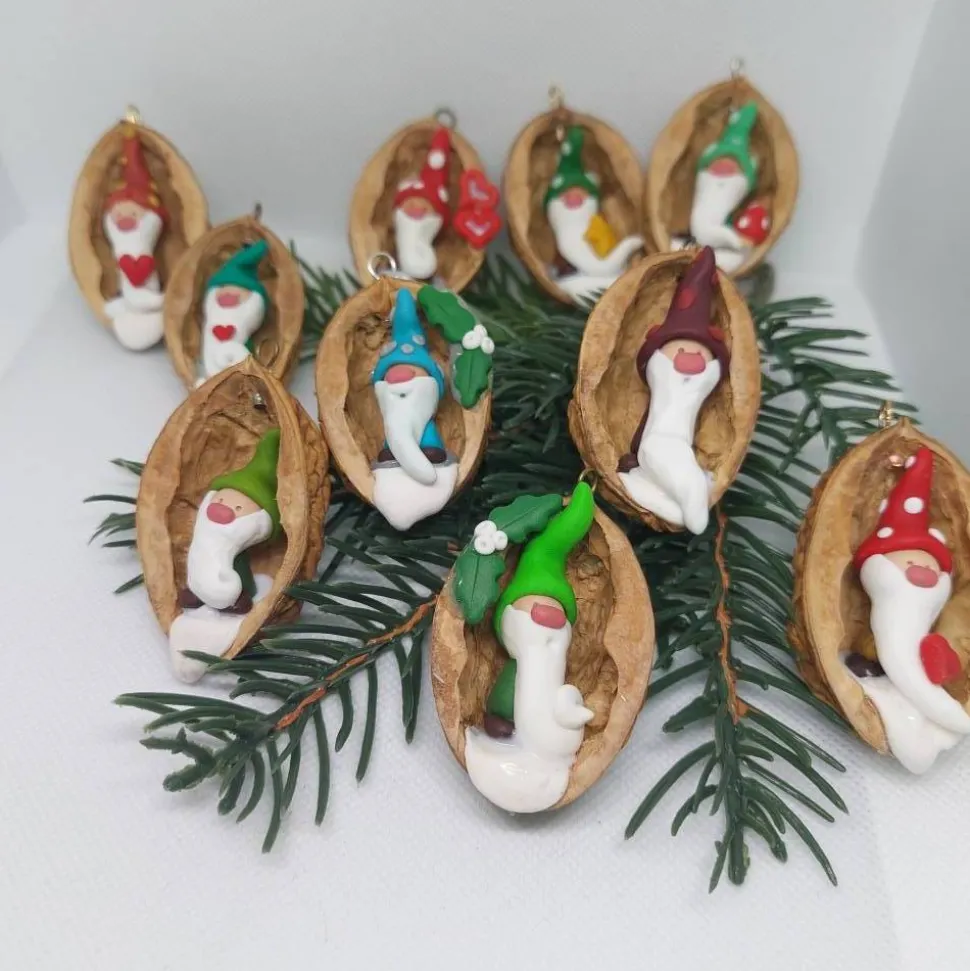 Handgemachte Weihnachtsbaum-Anhänger – Mini-Wichtel im Walnuss-Schalenhäuschen