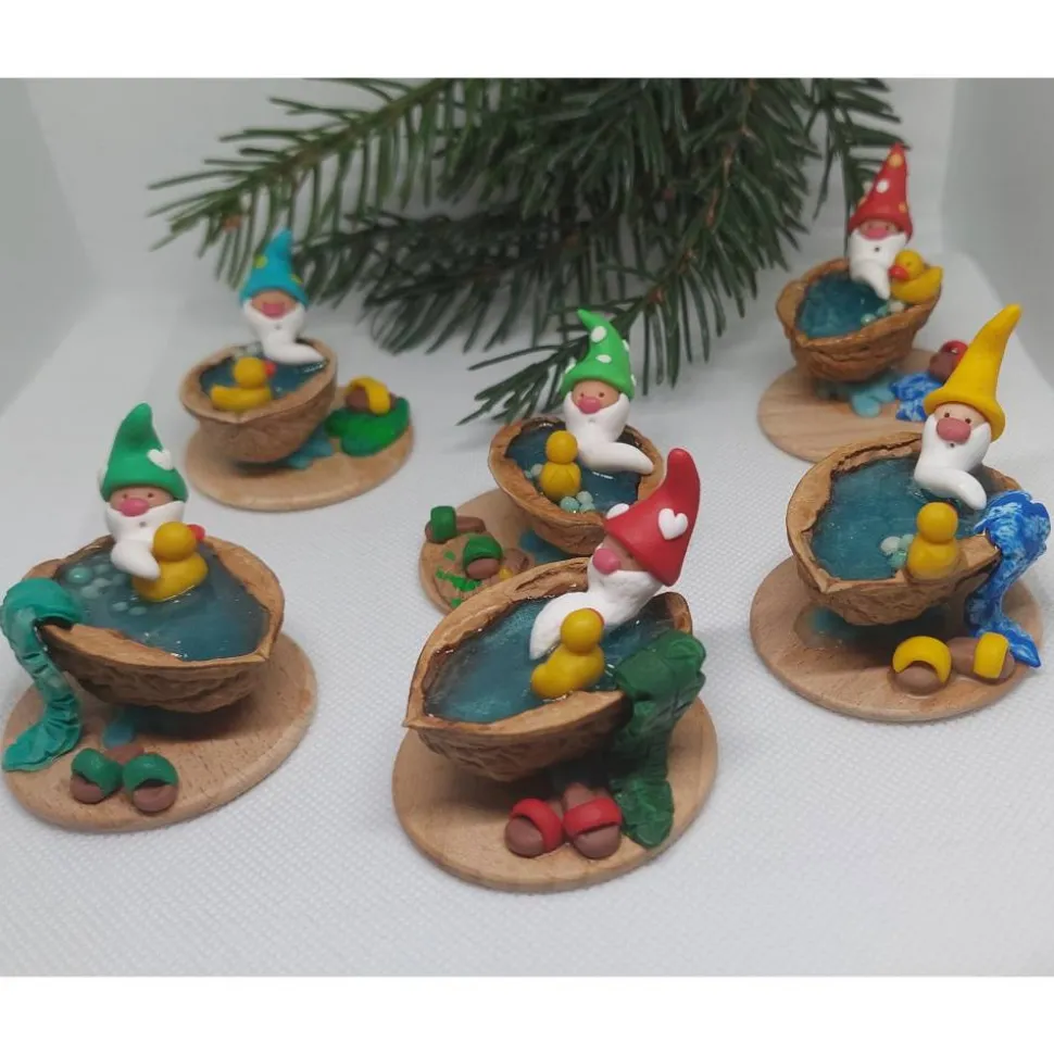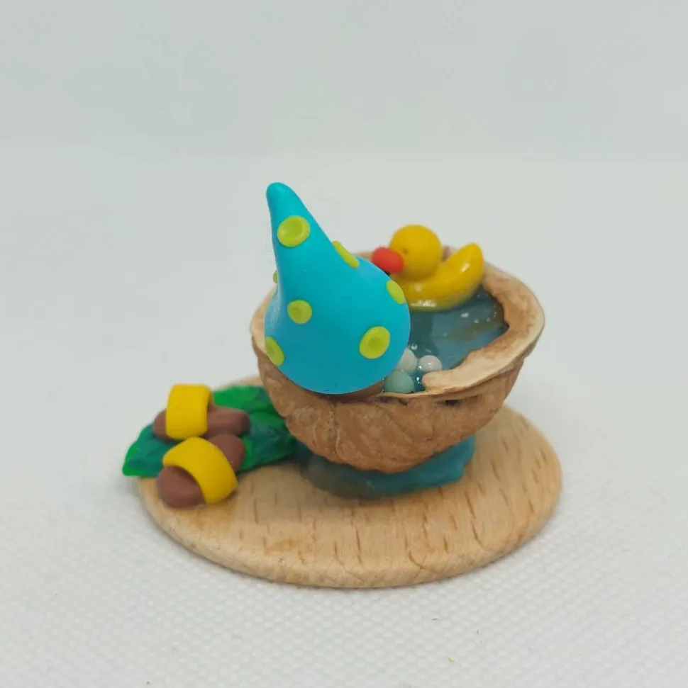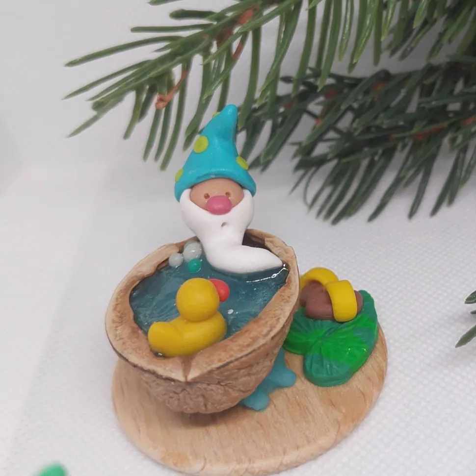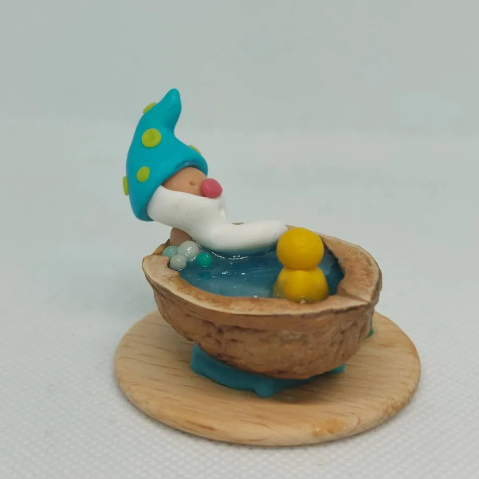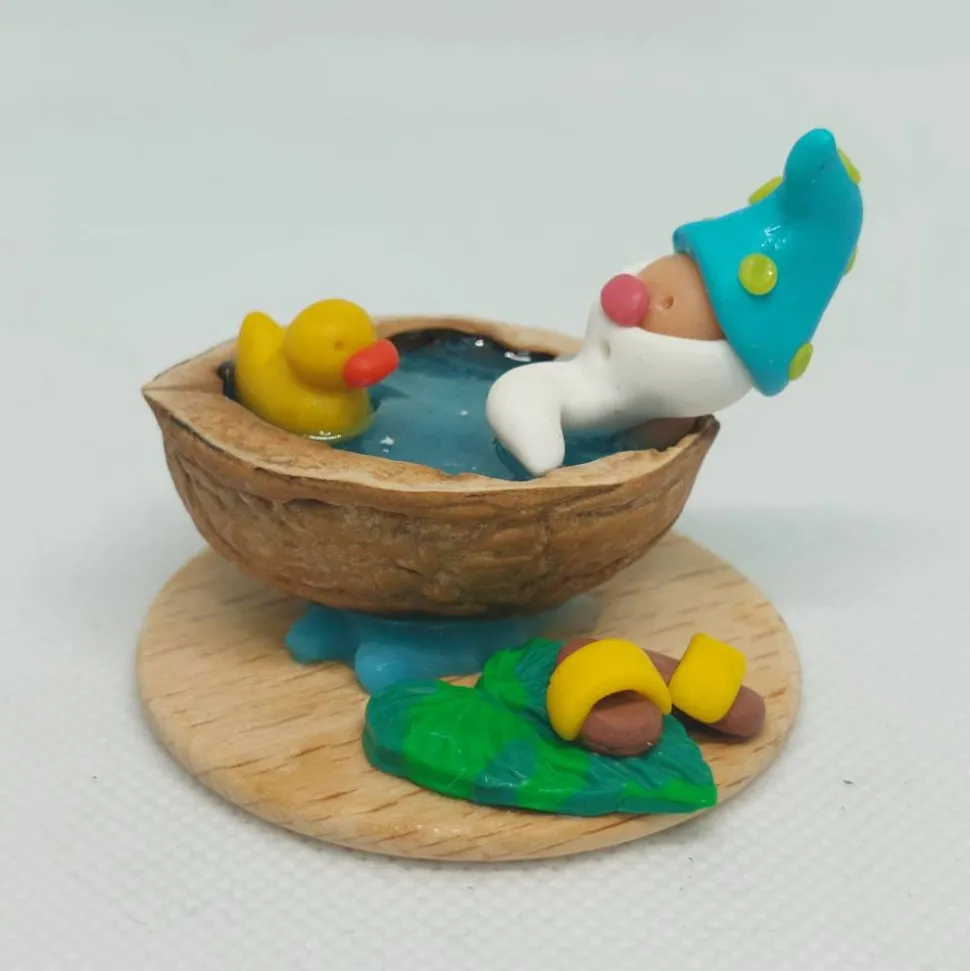 Diese liebevoll handgefertigte Miniatur zeigt einen fröhlichen kleinen Wichtel, der ein entspannendes Bad in einer Walnussschale genießt. Mit seiner hellblauen Zipfelmütze die mit gelben Punkten verziert ist, dem langem weißen Bart und einem gelben Quietscheentchen an seiner Seite verbreitet er sofort gute Laune. Die Walnussschale ist mit türkis glitzenden Epoxidharz gefüllt, das wie schimmerndes Wasser wirkt. Auf einer kleinen Holzplatte arrangiert, komplettieren ein blattförmige Badematte in Grüntönen , sowie passenden kleinen Badelatschen in gelb das charmante Szenenbild.