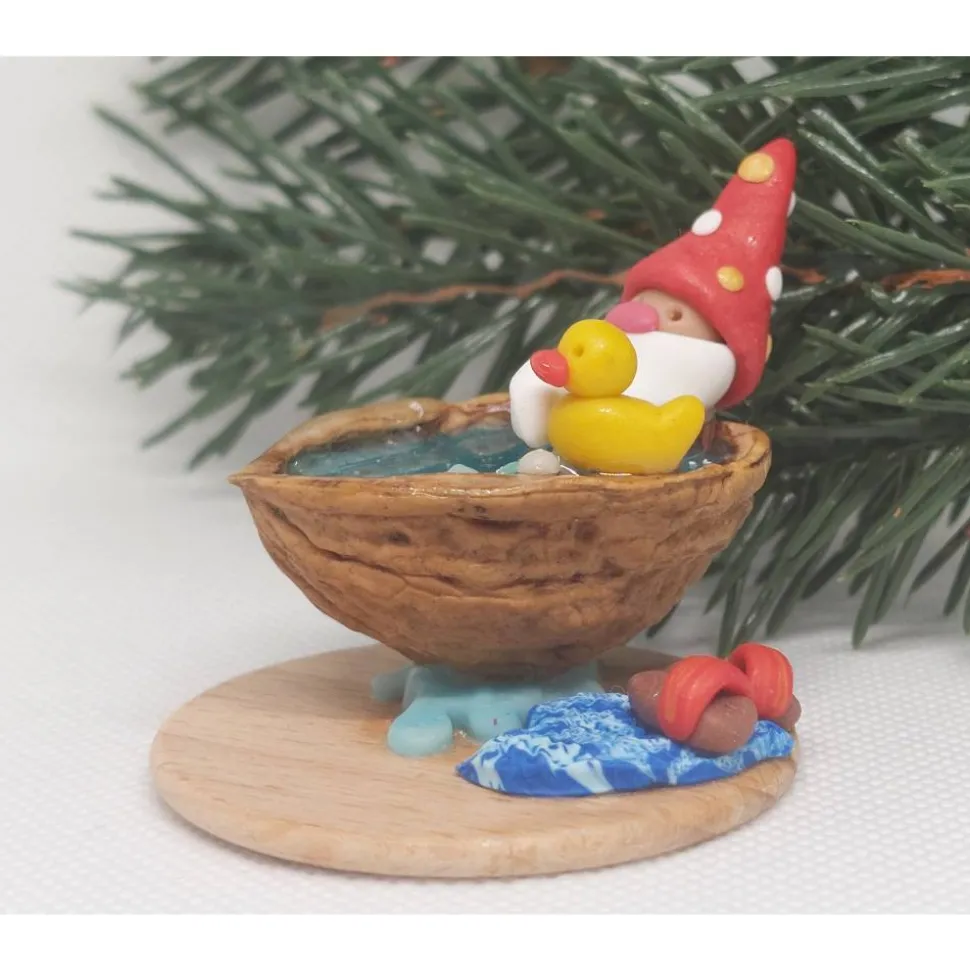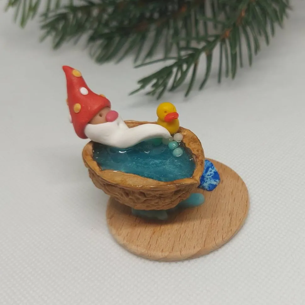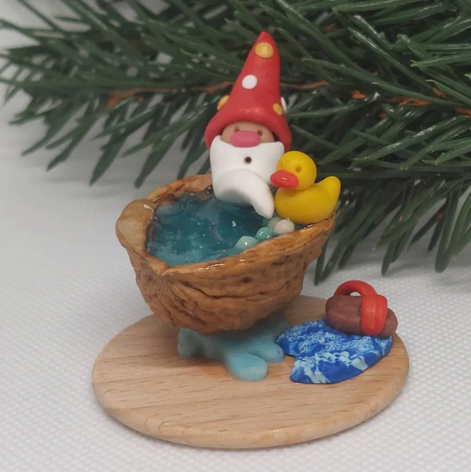 Diese liebevoll handgefertigte Miniatur zeigt einen fröhlichen kleinen Wichtel, der ein entspannendes Bad in einer Walnussschale genießt. Mit seiner rot/golden (wirkt da durch organe) Zipfemütze die mit weißen und golden Punkten verziert ist, dem langen weißen Bart und einem gelben Quietscheentchen an seiner Seite verbreitet er sofort gute Laune. Die Walnussschale ist mit türkis glitzernden Epoxidharz gefüllt, das wie schimmerndes Wasser wirkt. Auf einer kleinen Holzplatte arrangiert, komplettieren ein blaues blattförmiges Badetuch sowie passende kleine Badelatschen das Szenenbild.