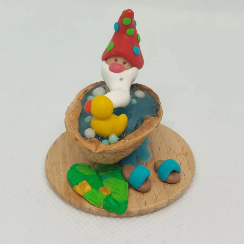 Diese liebevoll handgefertigte Miniatur zeigt einen fröhlichen kleinen Wichtel, der ein entspannendes Bad in einer Walnussschale genießt. Mit seiner rot Zipfemütze die mit grün und blaien Punkten verziert ist, dem langen weißen Bart und einem gelben Quietscheentchen an seiner Seite verbreitet er sofort gute Laune. Die Walnussschale ist mit türkis glitzernden Epoxidharz gefüllt, das wie schimmerndes Wasser wirkt. Auf einer kleinen Holzplatte arrangiert, komplettieren ein blattförmige Badematte, sowie passende kleine Badelatschen das Szenenbild.