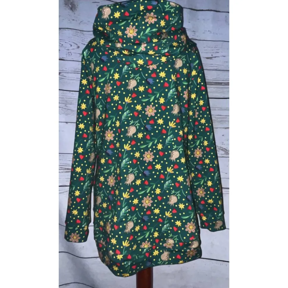-> Der Kombistoff hat viele Blüten, Herzen, Zweige. Die Farben sind hell- und dunkelgrün, gelb, rot, hellbraun, dunkelblau und jeansblau. Die Grundfarbe ist dunkelgrün/tannengrün.