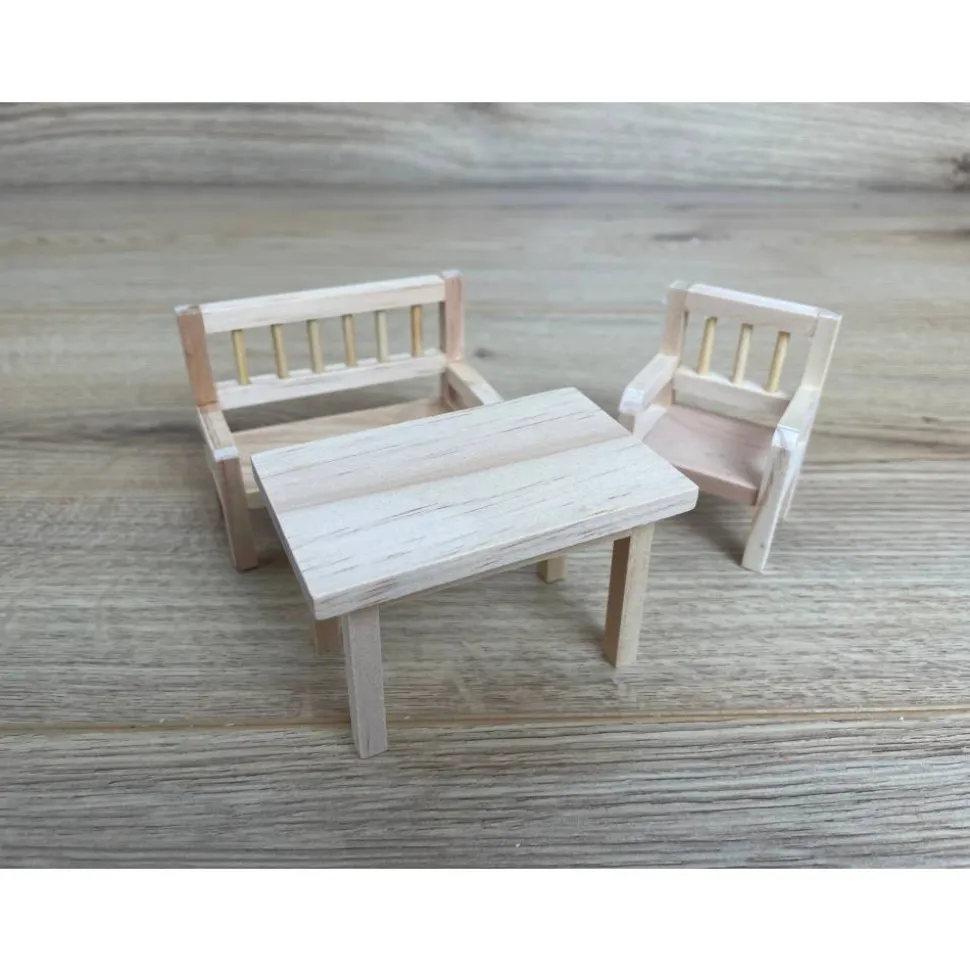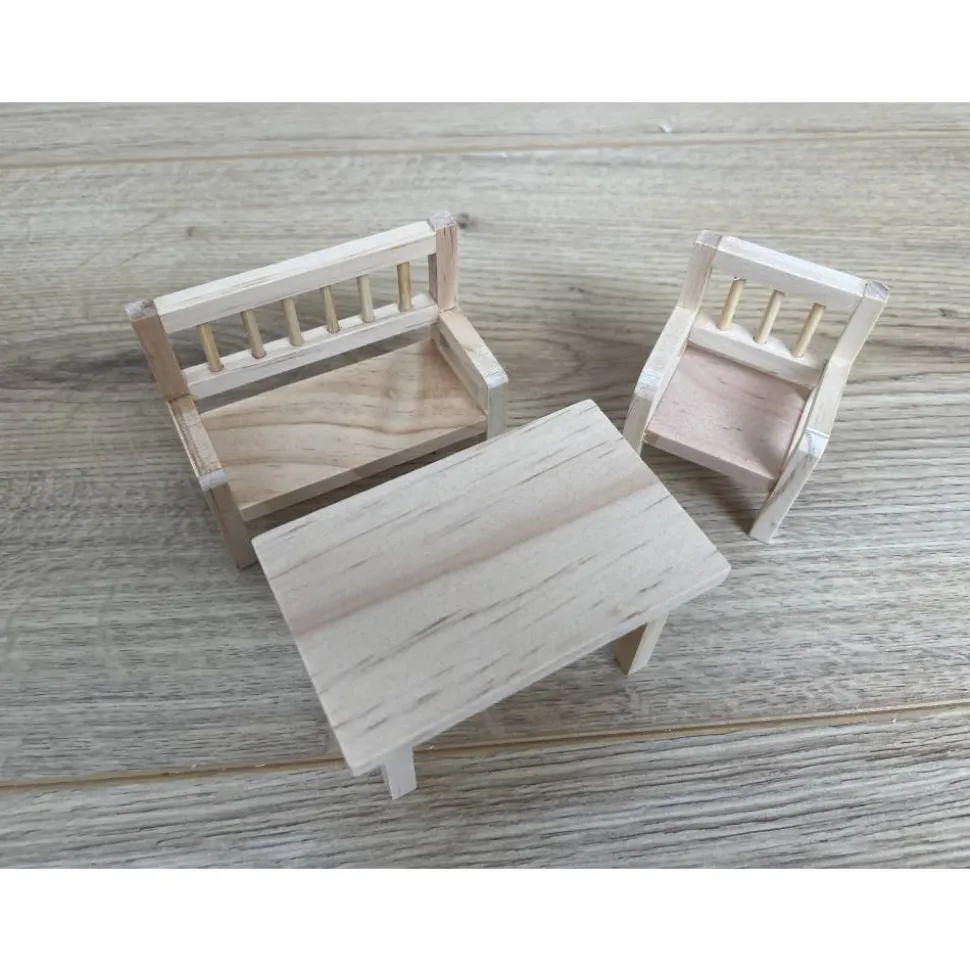 Im Set enthalten sind eine Bank, ein Stuhl und ein passender Tisch.