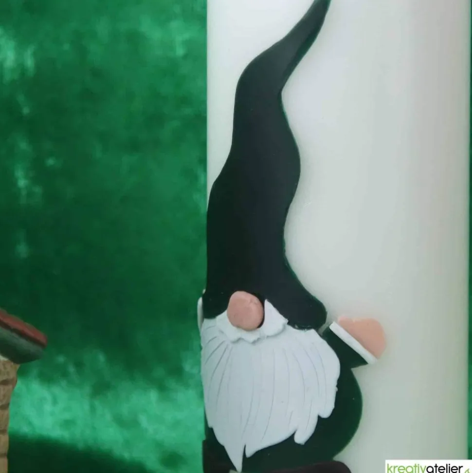 Der besondere Clou dieser Weihnachtskerze ist der grüne Wichtel mit seiner knubbeligen Nase, seinem weißen Bart und der spitzen Zipfelmütze, der in sorgfältiger Handarbeit aus mehreren Wachslagen geformt wird.
