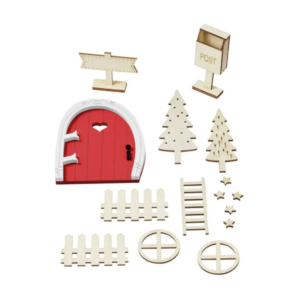 Dieses 11-teilige Wichtelset bringt alles mit, was du für eine zauberhafte Miniatur-Szene brauchst. Die rote Holztür mit weißem Rand und dem süßen Herzfenster bildet den Mittelpunkt – rundherum warten naturbelassene Holzelemente darauf, kreativ gestaltet und in eine magische Wintergeschichte verwandelt zu werden.