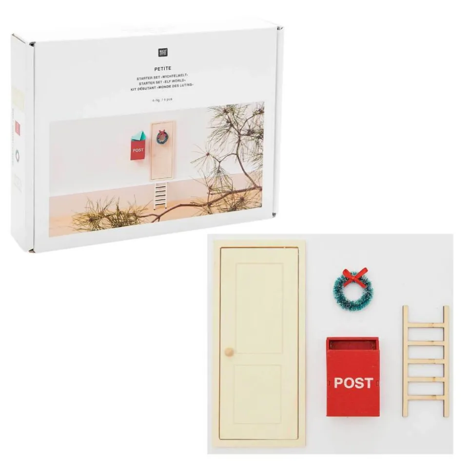 In dem Set ist eine Tür, Leiter, Briefkasten und ein Kranz enthalten. Mit diesem Set lässt sich eine kleine Wichtelwelt für die Vorweihnachtszeit schnell einrichten. Die Grundausstattung, um einem Wichtel ein Zuhause zu geben. Die Tür und die Leiter lassen sich gern in Wunschfarbe bemalen und gestalten.
