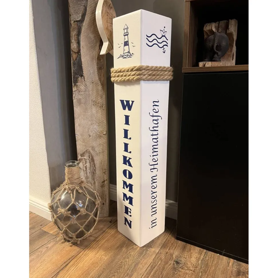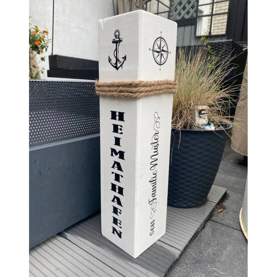 Wähle zwischen verschiedenen Höhen – 50 cm, 60 cm, 70 cm oder 80 cm – und genieße die hochwertige Verarbeitung: Die Säule misst ca. 10 × 10 cm, ist geschliffen, lackiert und wetterbeständig. Die Schrift besteht aus langlebiger Vinylfolie, verschiedene Farben und Schriftarten stehen dir zur Auswahl. Ein authentisches Seil rundet das maritime Design ab.