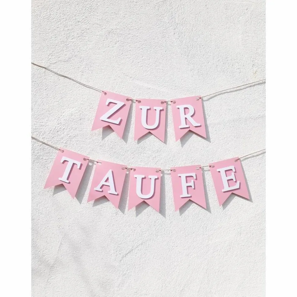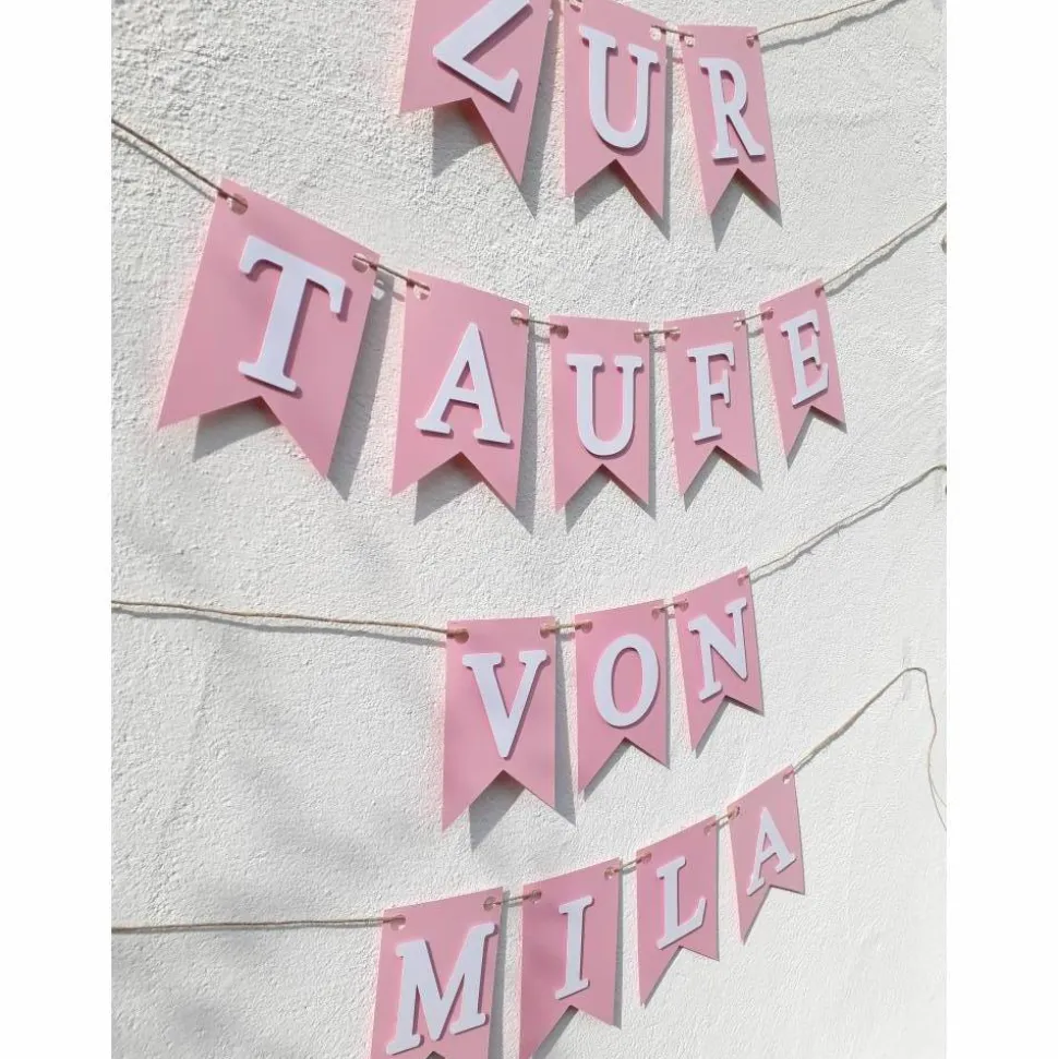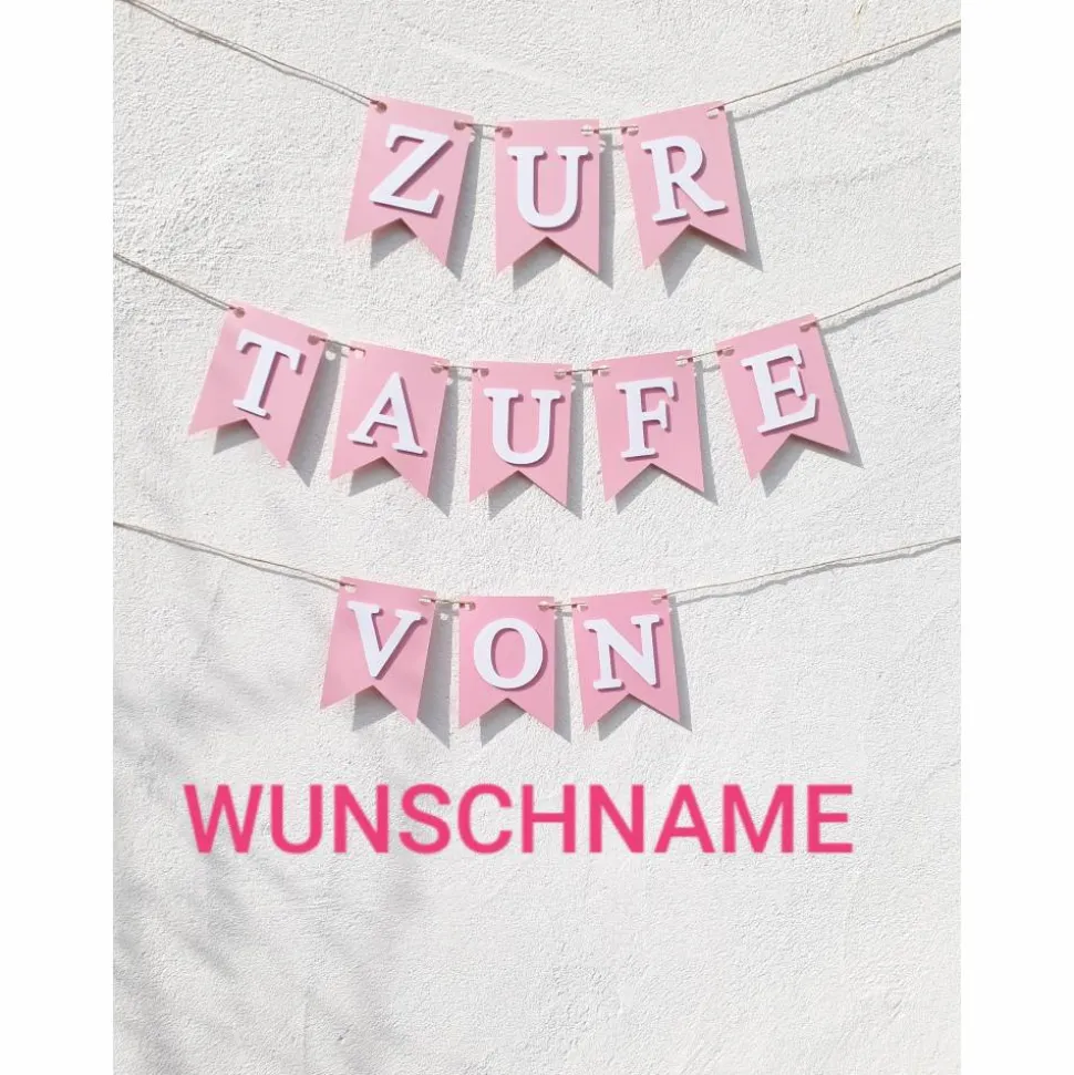 Wunderschöne Girlande zur Taufe. Auf Wunsch personalisiert mit dem Namen des Taufkindes. Hierfür bitte bei einer Bestellung die entsprechende Buchstabenanzahl auswählen. In hellem rosa mit klarer weißer Schrift. Aus hochwertigem Karton von Hand zusammen gesetzt.