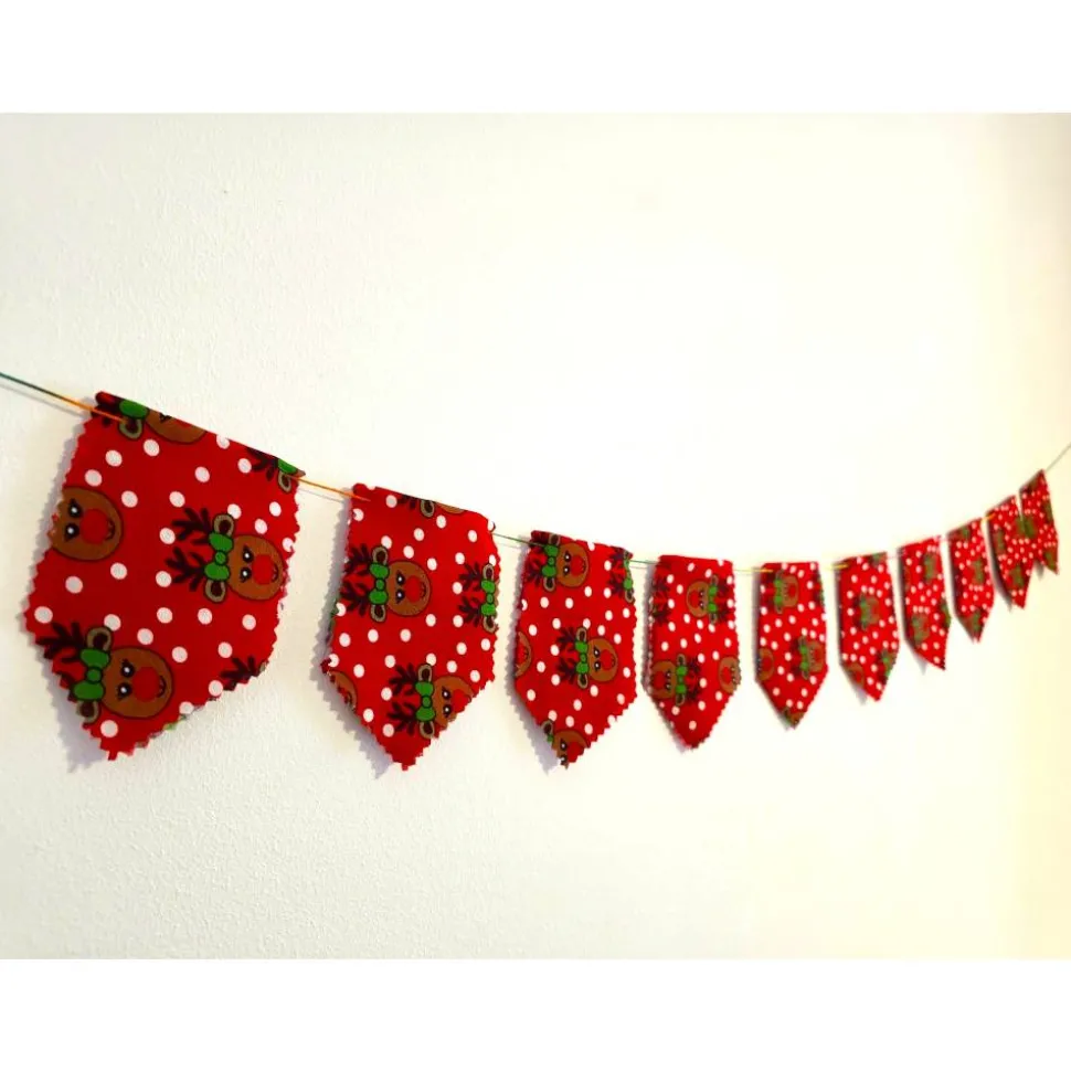 Diese liebevoll gestaltete Girlande bringt festliche Stimmung in jedes Zuhause! Sie besteht aus 10 Wimpeln aus einem hochwertigen Baumwoll-Polyester-Mix, die jeweils 6,5 cm breit und 10 cm hoch sind. Das charmante Rentierdesign ist beidseitig sichtbar, ideal für Fenster, Türen oder als Wanddeko.