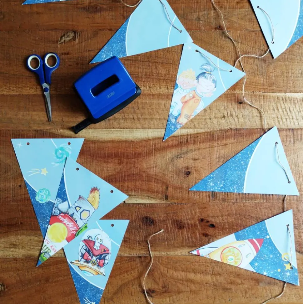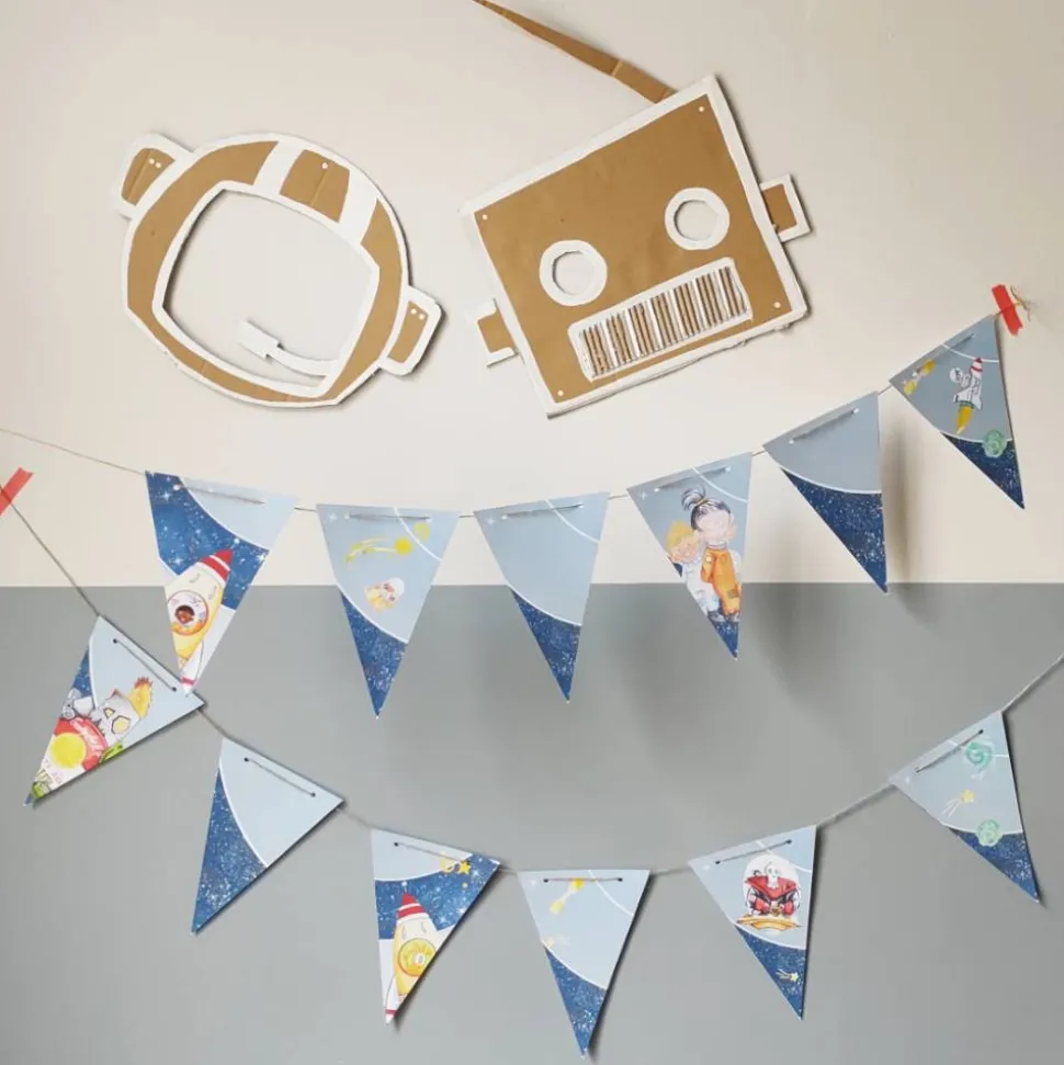 Hast du bereits unsere Mottobox Weltraum erworben, erhältst du mit dem Gutscheincode auf der Rückseite der Begrüßungskarte die Wimpelkette gratis. Einfach Code eingeben, ausschneiden, an den oberen Seiten Lochern, Schnur durchfädeln und aufhängen.